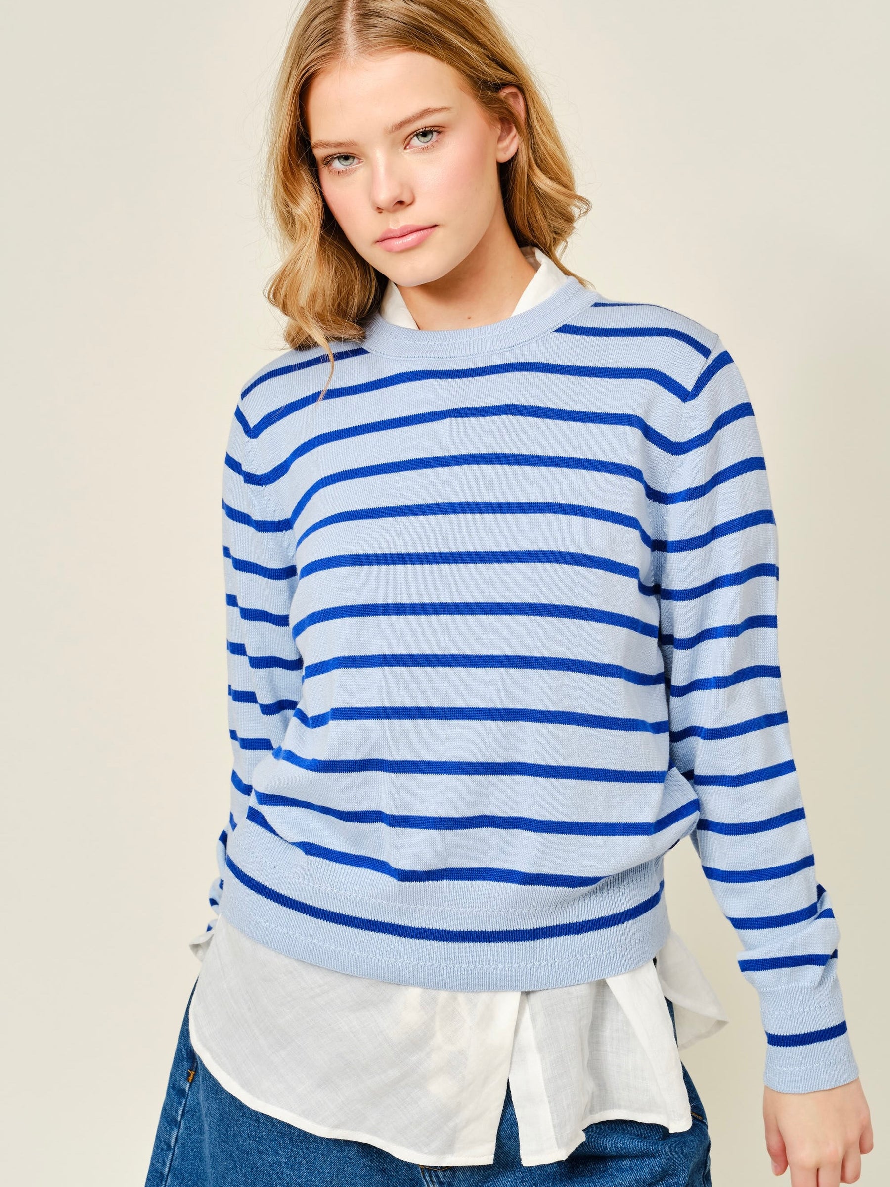 This Soft Striped Pullover Sweater is the kind of layer you’ll reach for again and again. Made from a lightweight knit with a classic fit, it features timeless stripes, a crew neckline, and long sleeves for easy, everyday styling. Perfect on its own or layered up when the temps dip just a bit.
