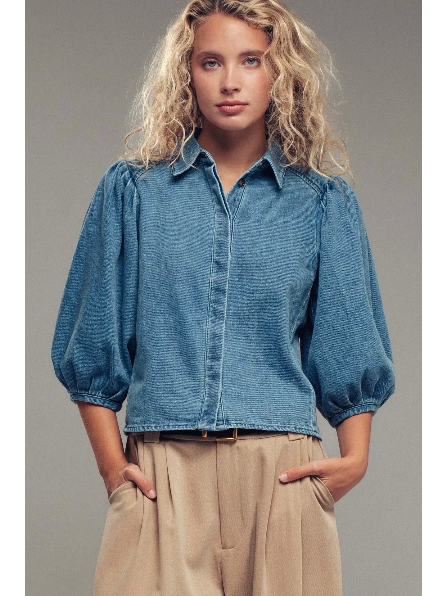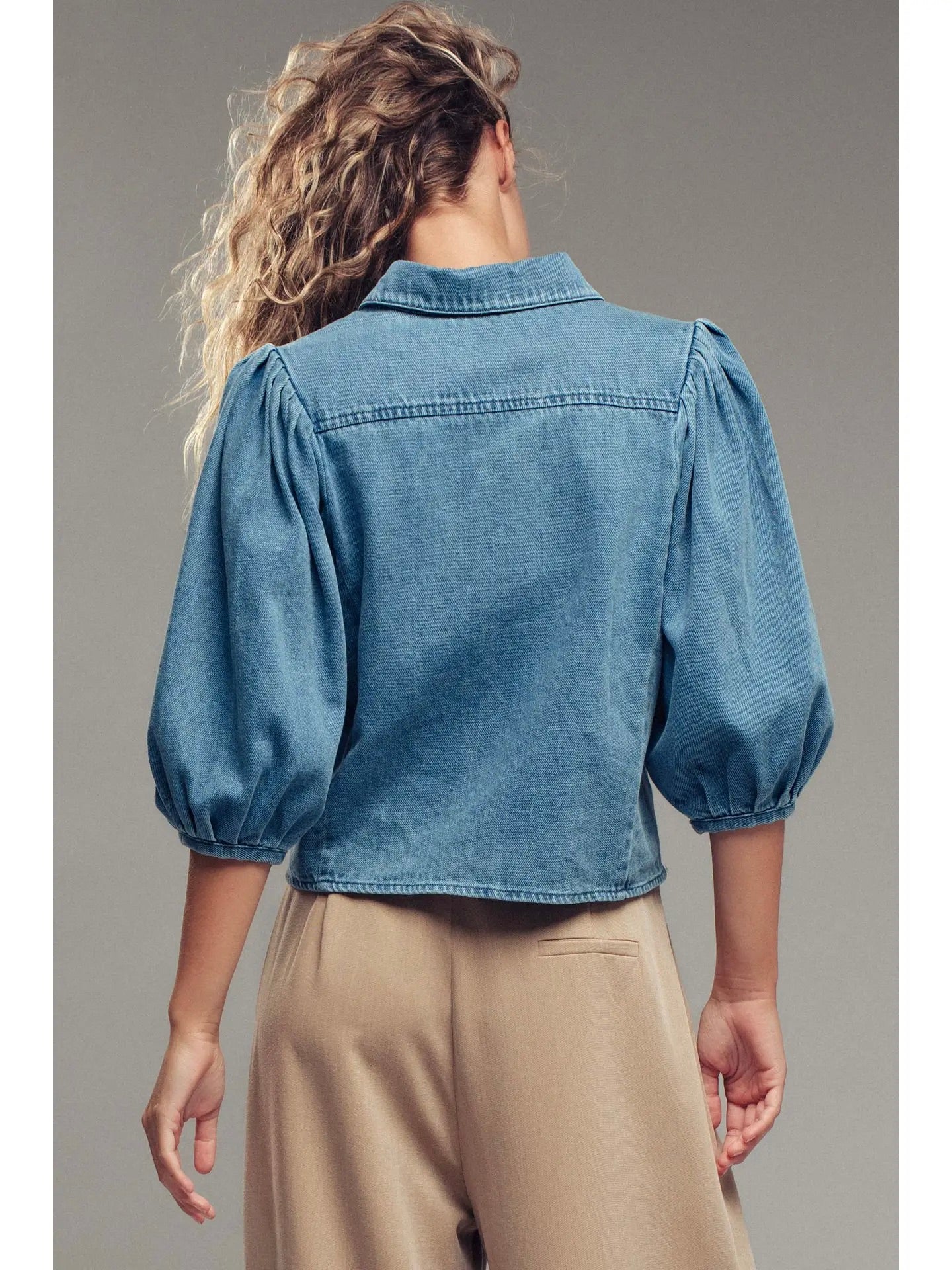 A fresh take on a classic, this Puff Sleeve Denim Top is crafted from soft, midweight 100% cotton for effortless comfort. Designed with gathered puff sleeves, a classic shirt collar, and a button front closure, it combines timeless tailoring with a touch of playful volume. Perfect for pairing with everything from sleek trousers to casual skirts, it brings easy polish to your everyday look.