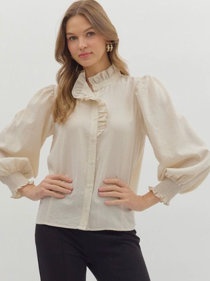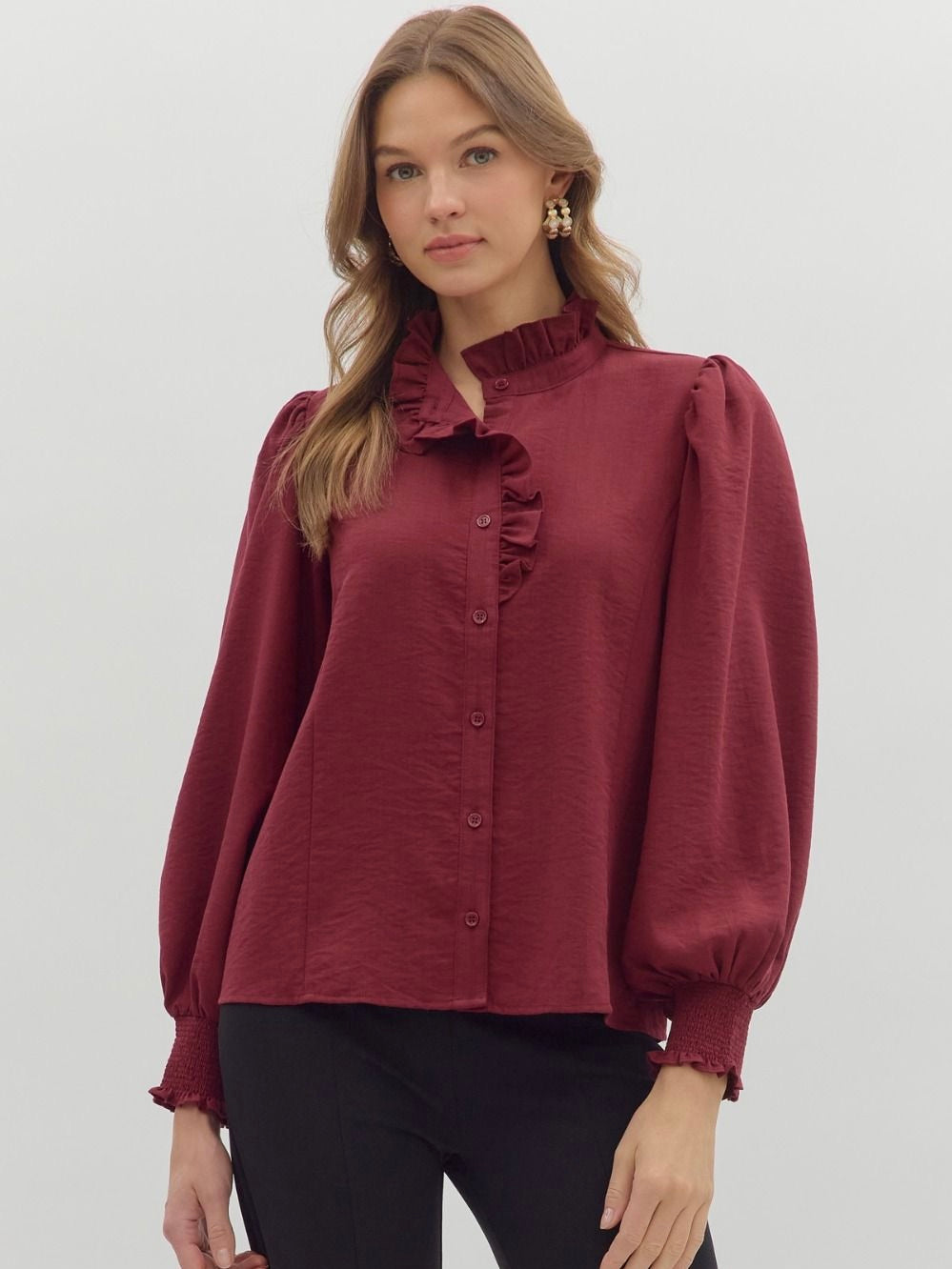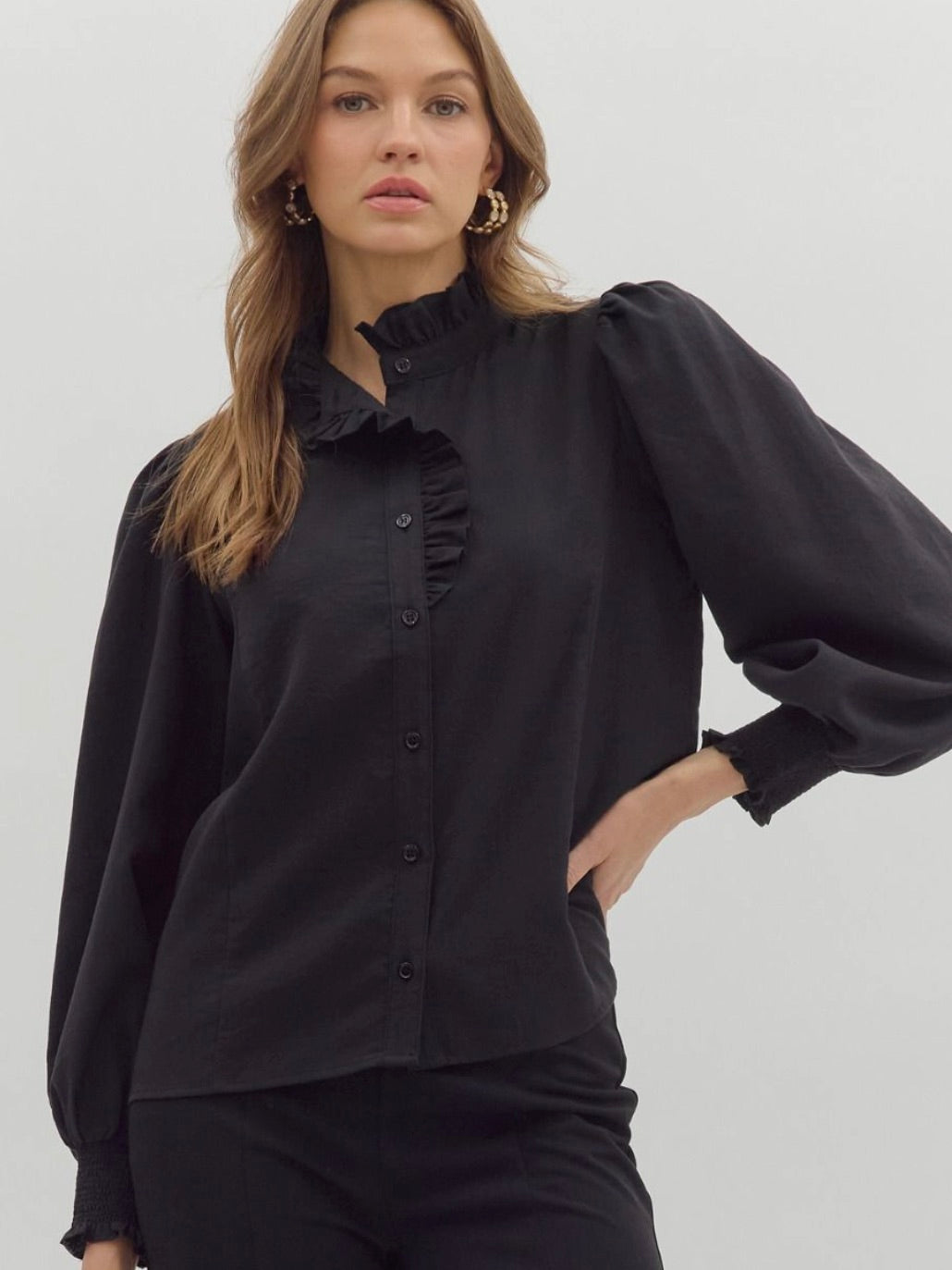 The Ruffle Accent Band Collar Top is all about subtle charm. Soft, lined fabric and a delicate ruffle detail add a feminine touch, while the band collar and long sleeves keep it polished. Pair it with skirts or pants for an effortlessly stylish look.