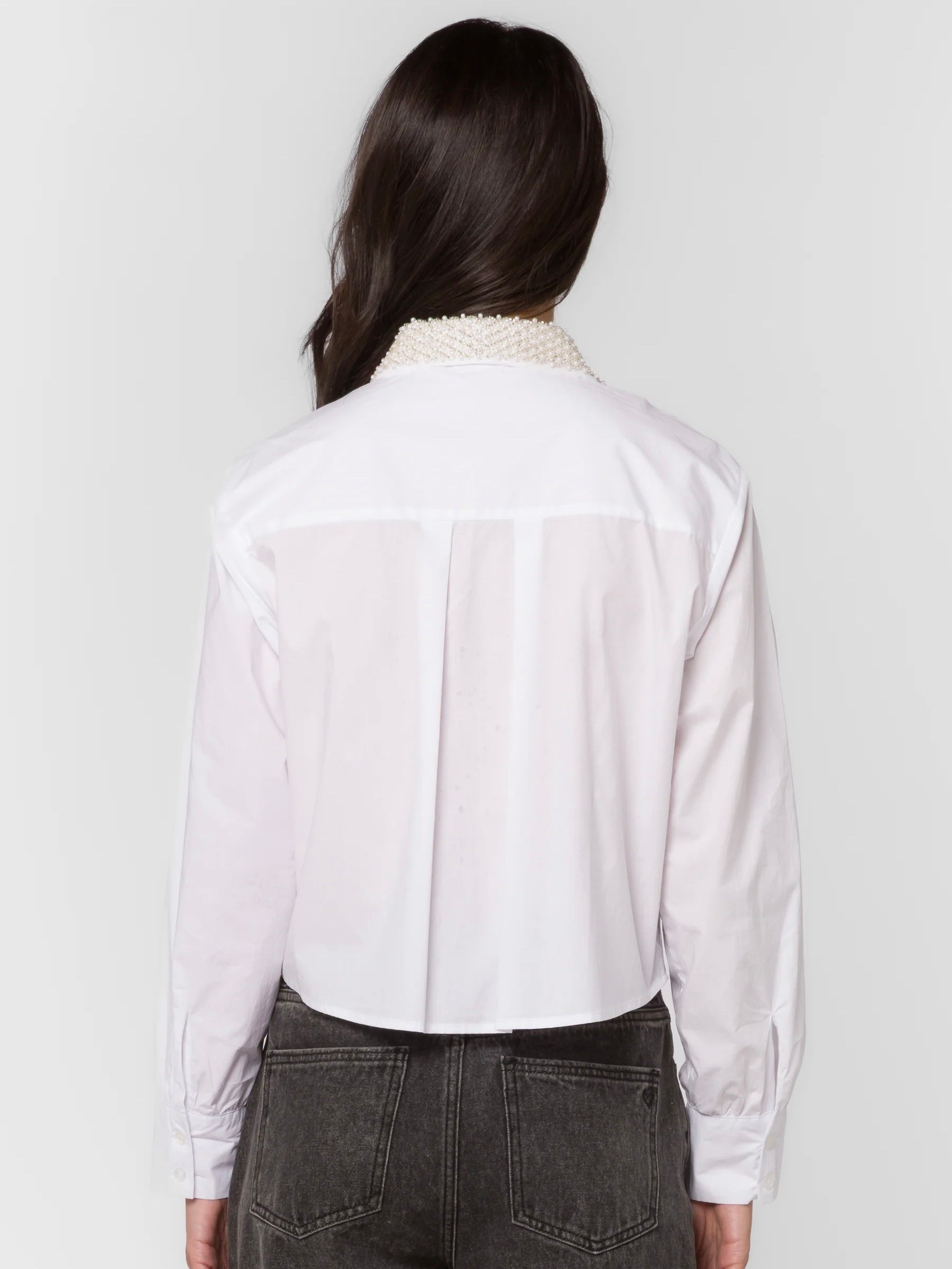Meet the Soleil Top—the buttoned-up crop with a side of sparkle. It features a full-front button placket, classic collar, and long sleeves with button cuffs, all accented by delicate pearl trim. Cropped just right, it’s polished enough for “look put together” vibes but flirty enough to pair with your favorite high-waisted jeans or skirts.