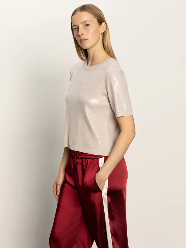 The Sparkle Sequin Sweater brings instant shine to any outfit without trying too hard. With a relaxed fit and easy pull-on style, it’s perfect for layering or wearing on its own for a touch of fun. Short sleeves and subtle ribbed cuffs keep it effortlessly chic.