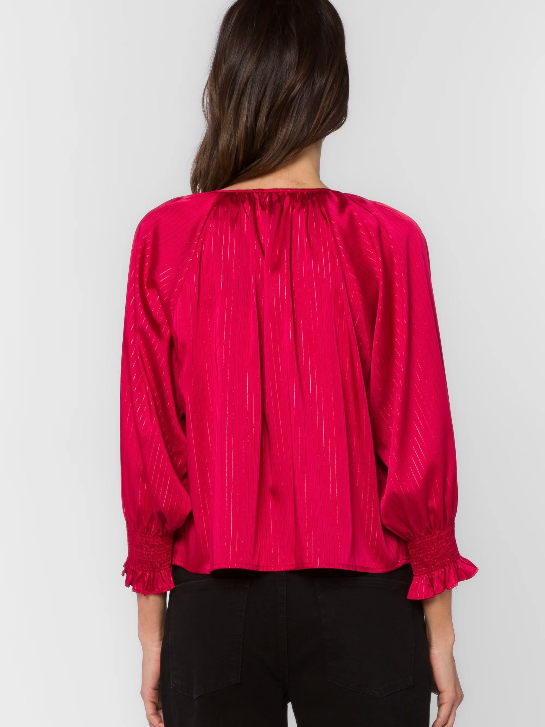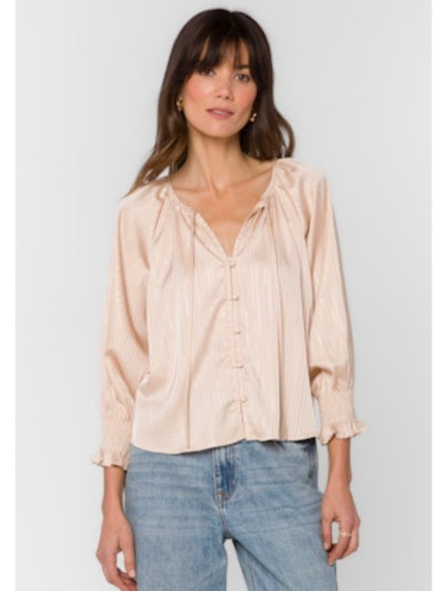 Elevate your wardrobe with the Velvet Heart Tina Blouse, featuring stylish raglan sleeves and sophisticated smoked cuffs for a refined touch. The button-front design and elegant tie at the neck add versatility and charm, making it perfect for both workdays and evenings out. This blouse effortlessly combines comfort with chic details to keep you looking polished all day long.