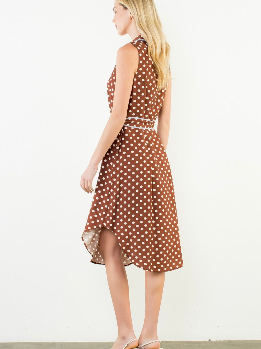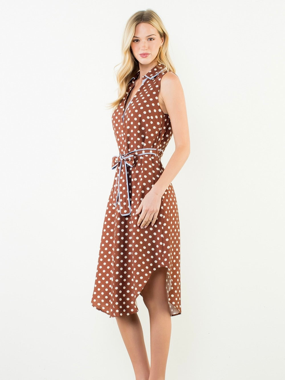 The Pretty Woman Dress is effortlessly chic with a timeless, feminine feel. Made from a lightweight rayon blend, it features a crisp collar, flattering V neckline, and button-down front. The sleeveless silhouette and self-tie belt create a beautifully defined shape, while the midi length keeps the look polished and versatile—perfect for everything from daytime plans to dinner out.