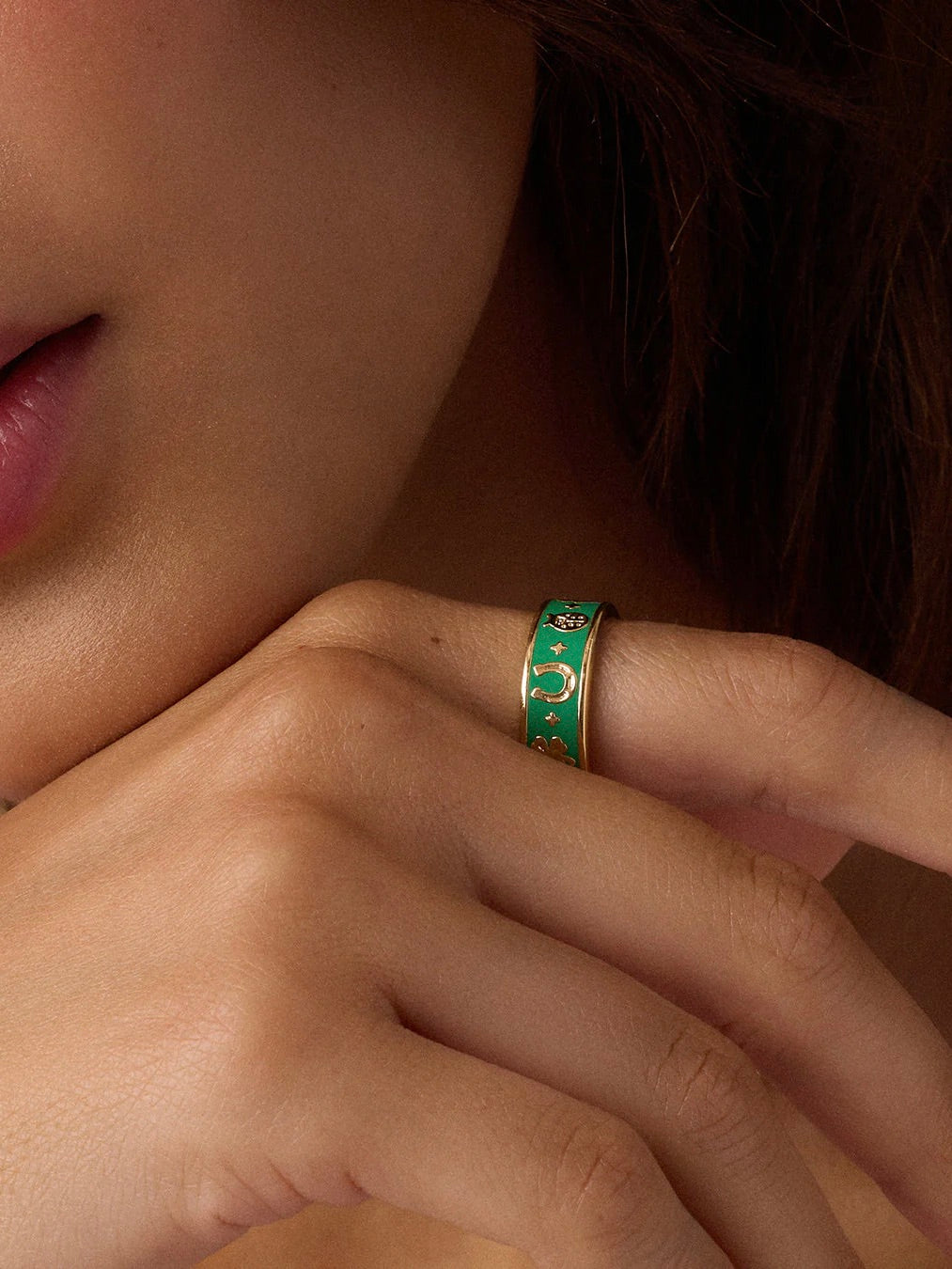 This colorful kelly green enamel and gold plated ring symbolizes luck and opportunity, and features a meaningful four-leaf clover, horseshoe and ladybug. Stack your ring or wear it solo. It's lightweight, eye-catching, and made for every outfit you own.