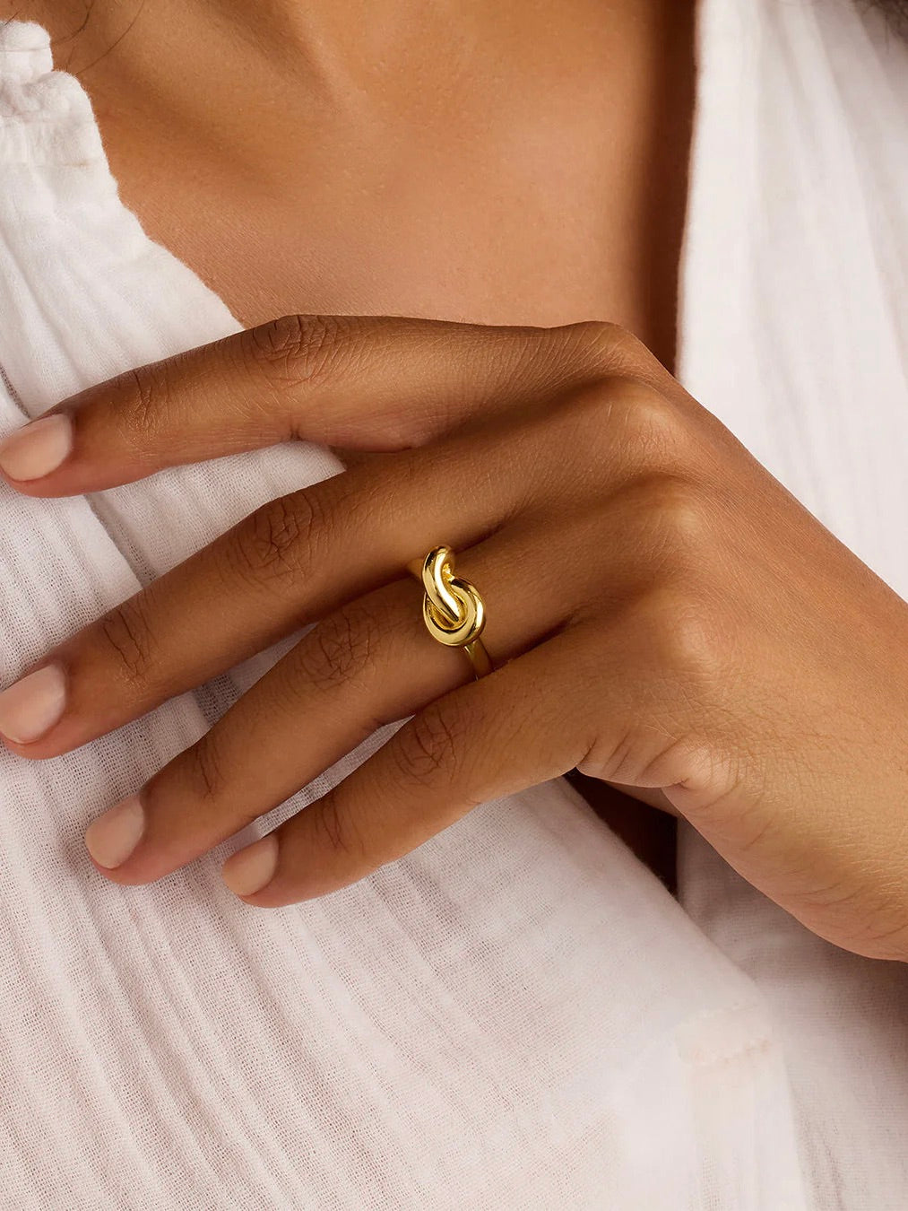 Make a statement with the Infinity Knot Ring. This stunning gold plated knot ring brings eye-catching shine to your daily ring stack. Its unique design is easy to love and perfect for adding a touch of elegance to any outfit.