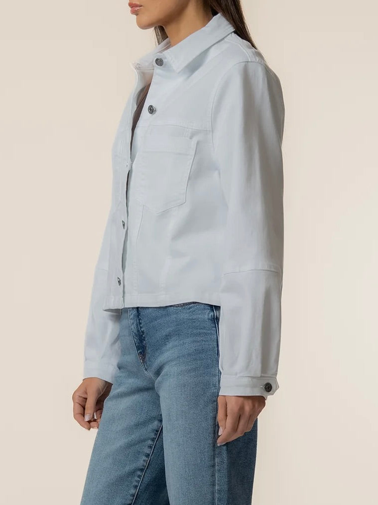 The Bailey Button Front Jacket in white denim is a fresh take on a classic staple. Crisp and clean with a structured feel, it instantly brightens up any look. The tailored fit and chest pockets keep it polished, while the hint of stretch makes it easy to wear all day. Toss it over anything from soft neutrals to bold prints for that effortlessly cool, pulled-together vibe.