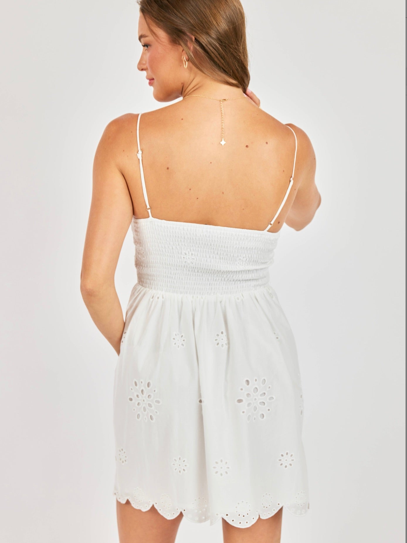 The Bloomfield Eyelet Mini Dress is pure warm-weather charm. Made from breathable cotton with delicate eyelet detail, it features a square neckline, adjustable straps, and a scalloped hem for an easy, playful finish. Fully lined and effortlessly wearable, it’s the kind of throw-on dress that feels just as good at a sunny brunch as it does on a casual night out.