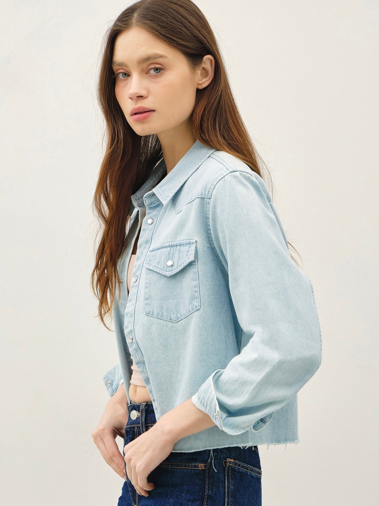 The Crop Western Shacket is a playful, laid-back layer with a modern edge. Made from 100% cotton, it features a classic collar, snap-front closure, and chest pockets for a Western-inspired vibe. Finished with a raw hem and cropped fit, it’s perfect for layering over tees, tanks, or dresses for effortless everyday style.
