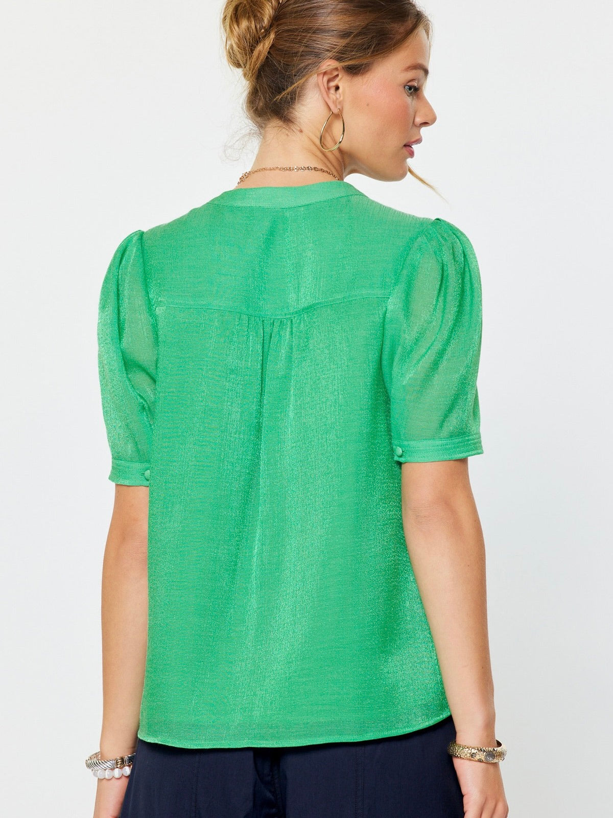 The Jennifer Short Sleeve Blouse is an easy, polished piece with soft, feminine detail. Designed with a flattering V neckline, short puff sleeves, and gentle gathering, it has a lightweight feel with a smooth, lined finish. Perfect for workdays or weekends, this blouse pairs effortlessly with denim, skirts, or tailored pants.