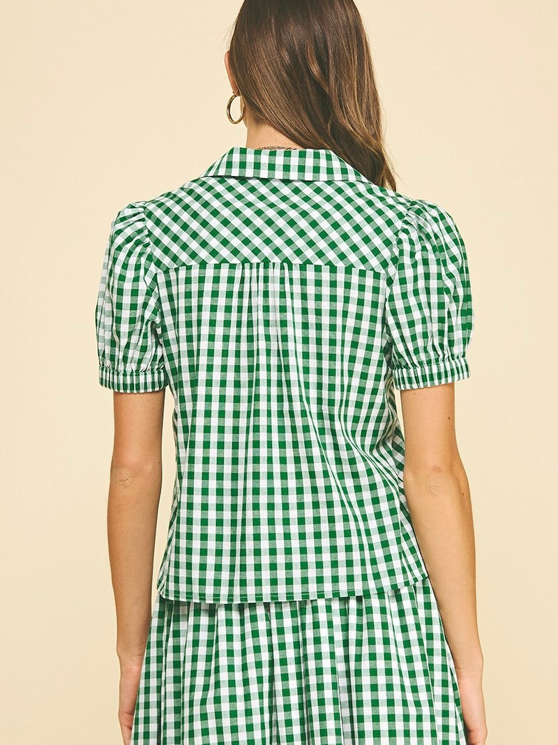 The Gingham Button Down Shirt is a fresh take on a timeless favorite. Made from crisp cotton, it features a classic collar, flattering V neckline, and button-down front. Finished with short puff sleeves, this top adds a soft, playful touch to an everyday staple—perfect with denim, shorts, or skirts for easy, polished style.