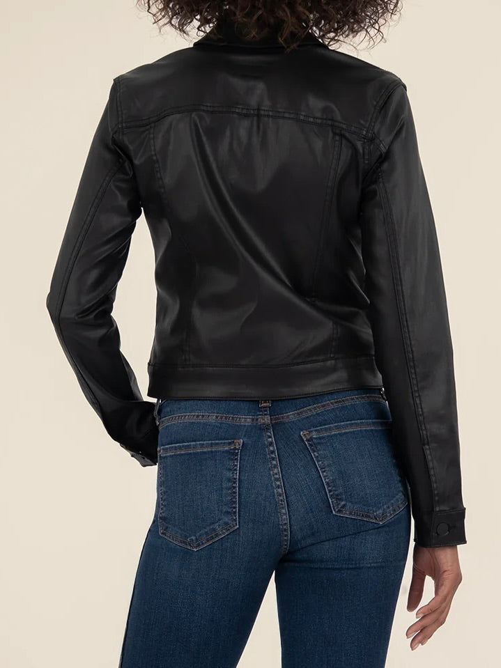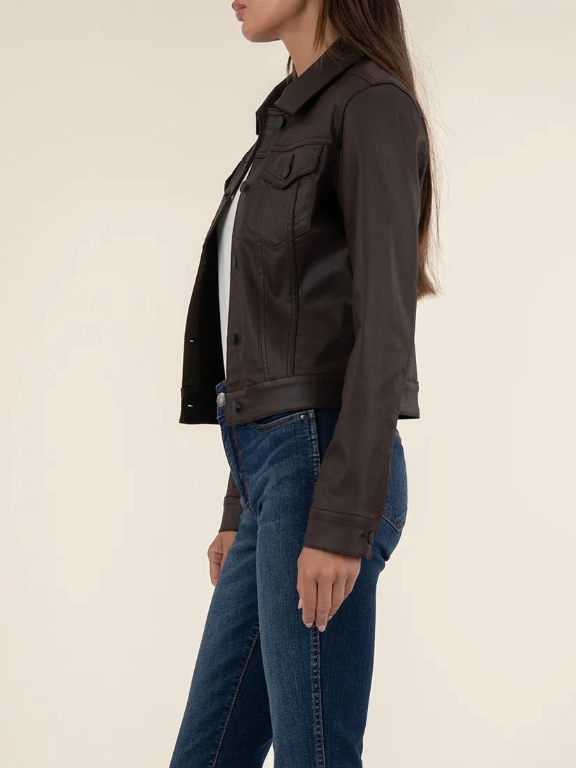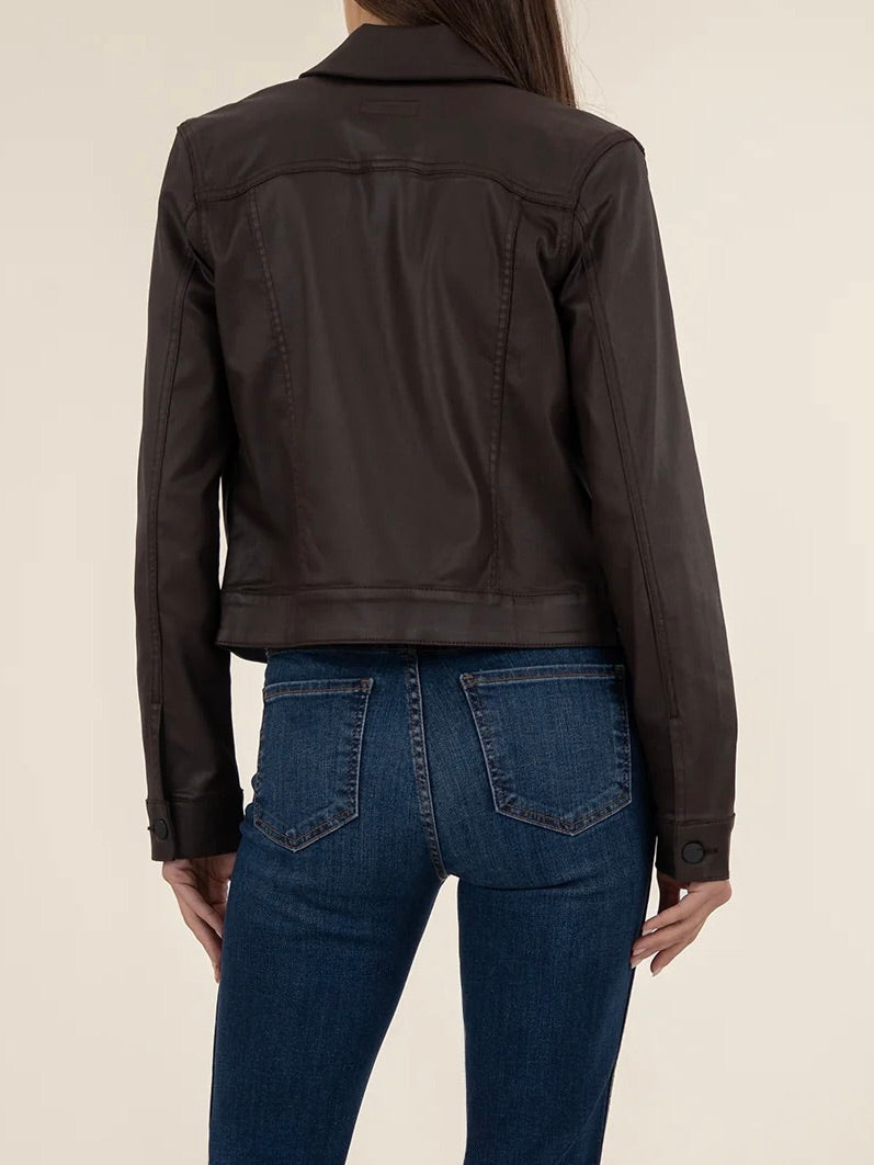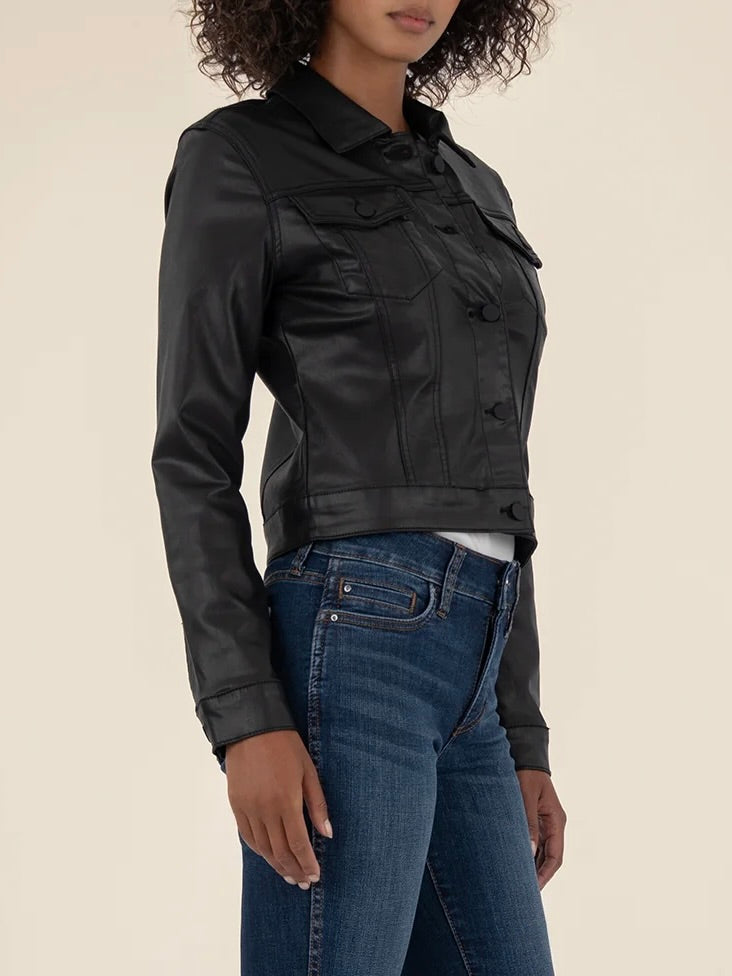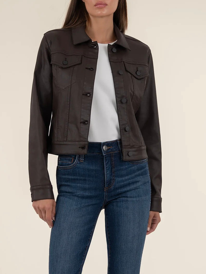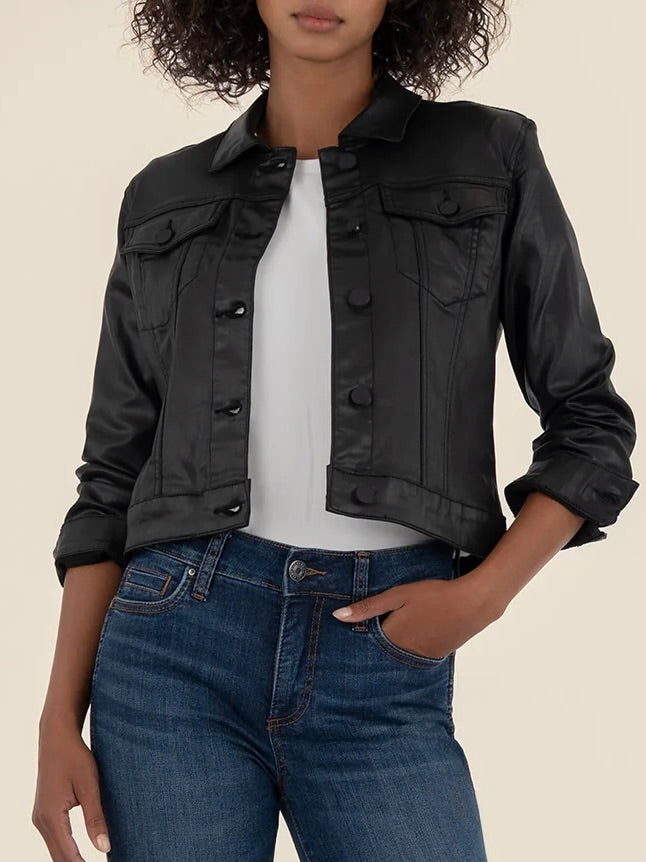 Coated for an elevated casual look, this slightly cropped trucker jacket is made from lightweight stretch denim in a coated fabric that is a staple.