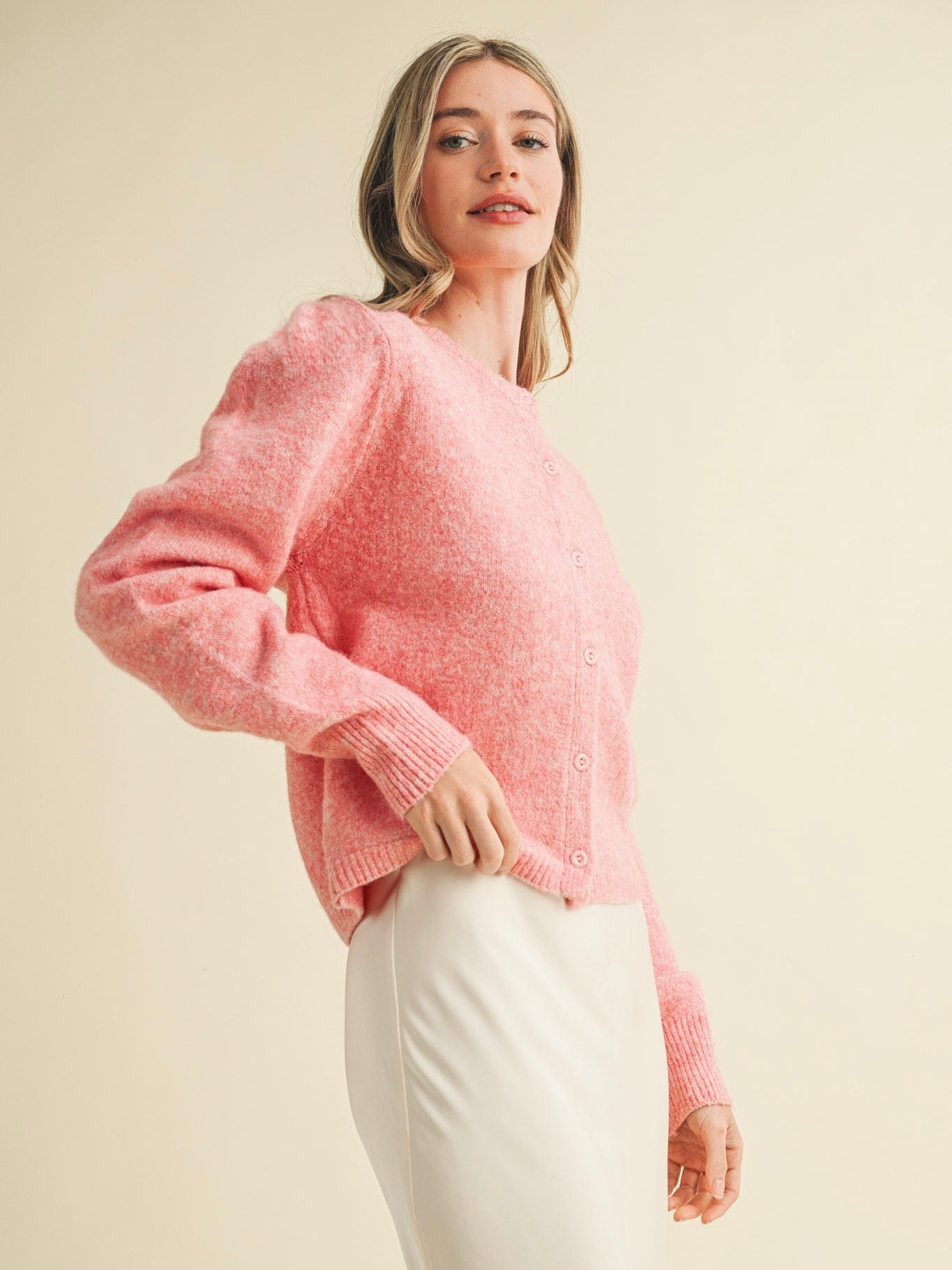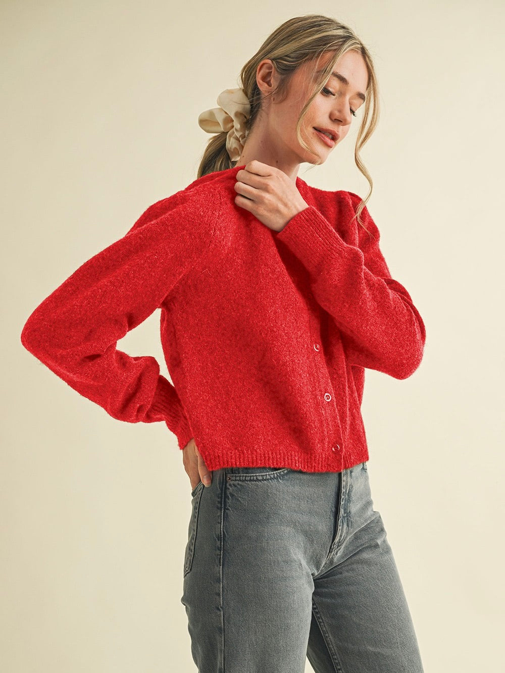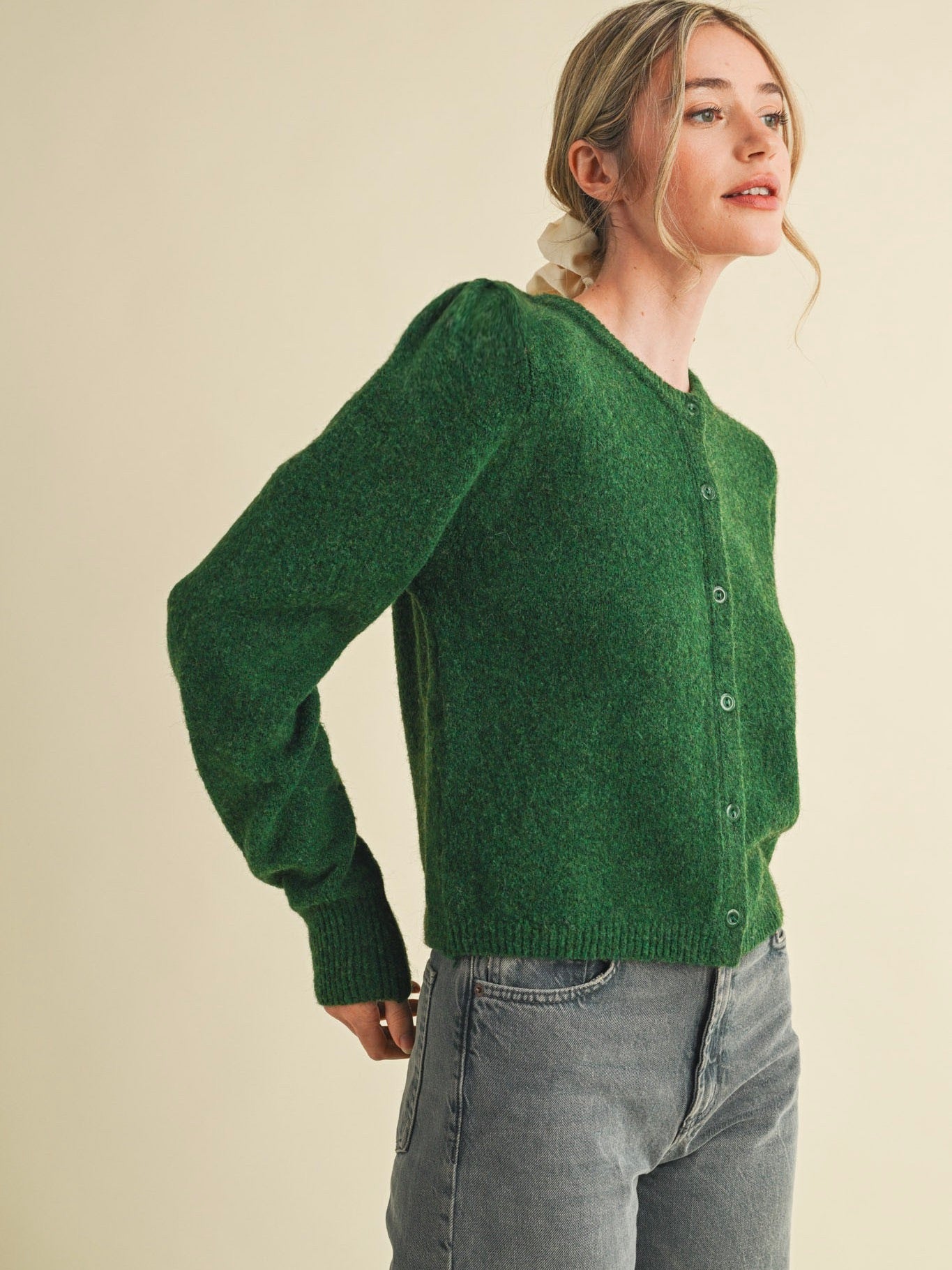 Step into cozy sophistication with the Rachel Cardigan! Its round neckline and classic fit make it effortlessly versatile, perfect for layering over dresses, tees, or blouses. Long puff sleeves add a playful touch, bringing subtle drama to a timeless silhouette.