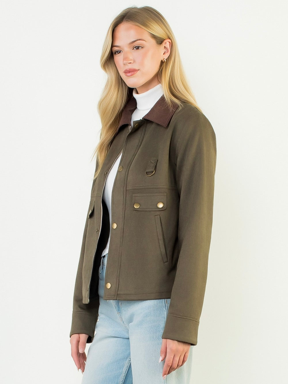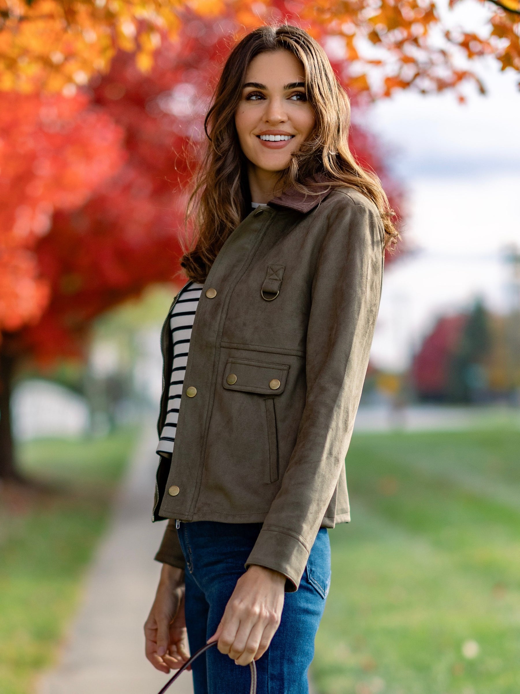 The Maria Mixed Media Suede Jacket is a chic twist on a classic. With a sleek collared design, dual zipper and snap front, and handy pockets, it’s the perfect layer to elevate any outfit with effortless style. Throw it on and instantly add a cool, modern edge to everything from jeans to dresses.