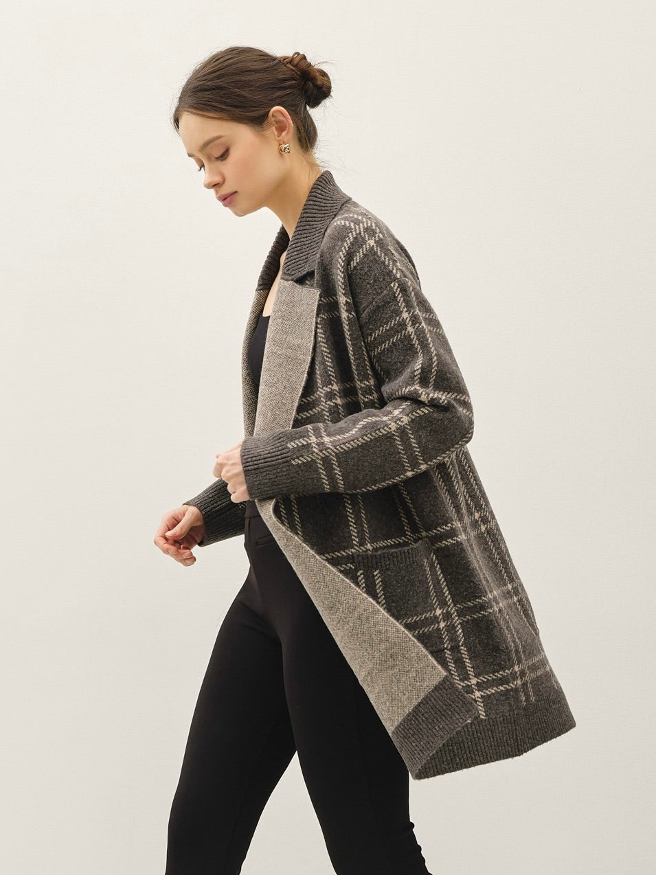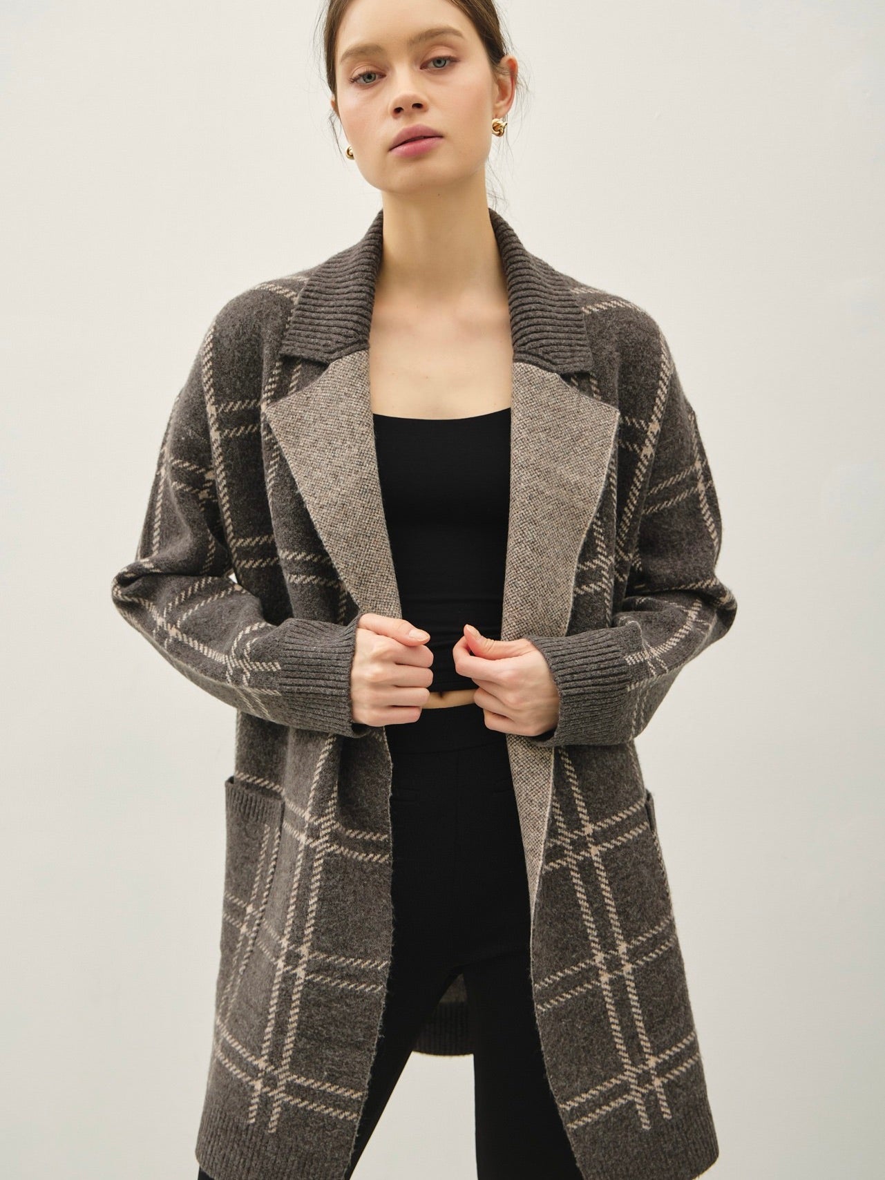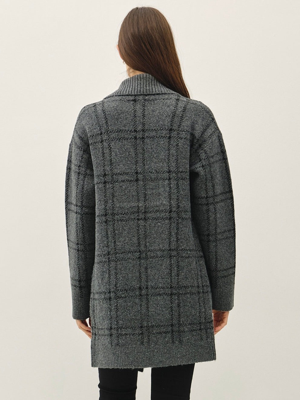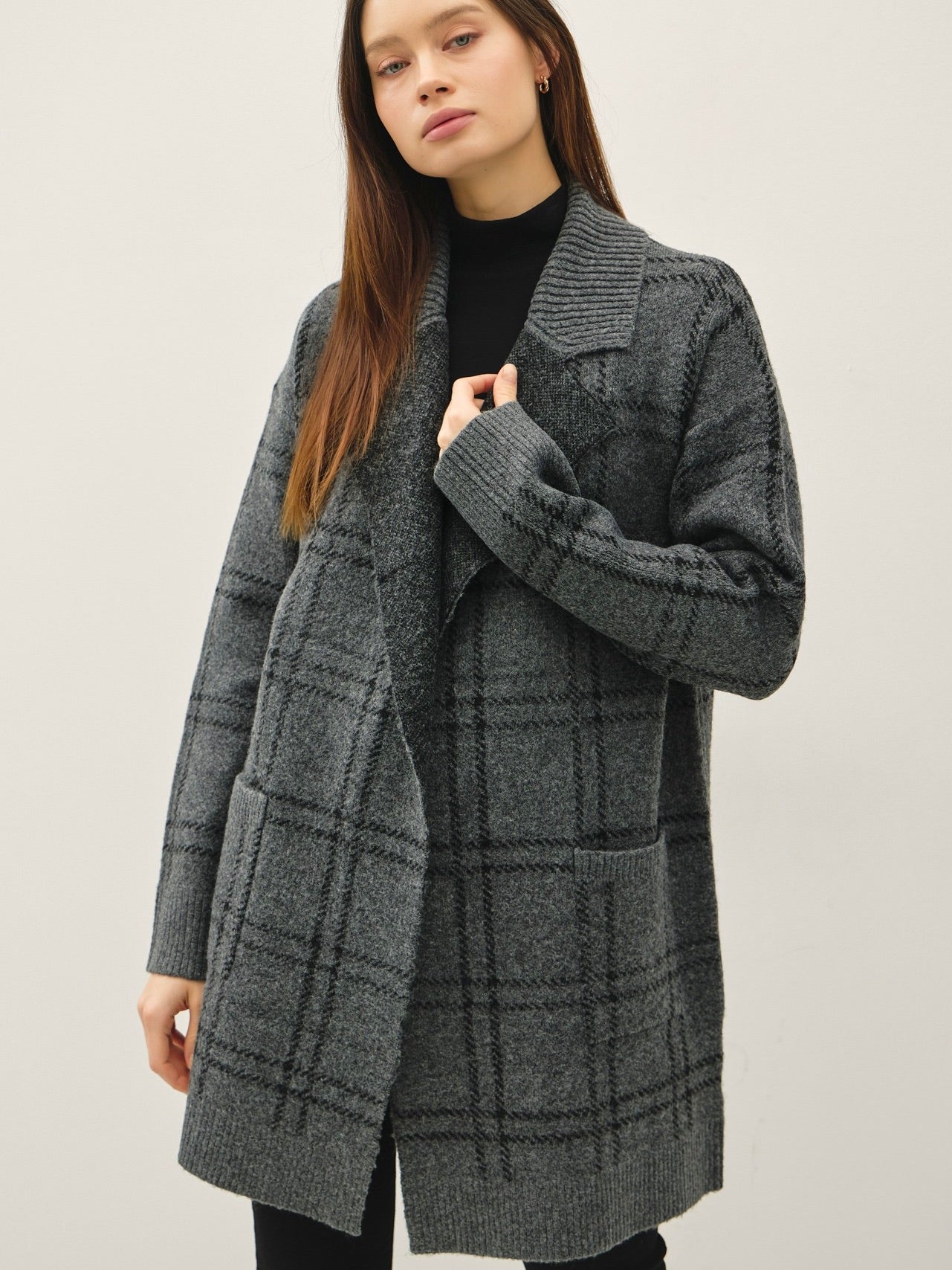 Wrap yourself in cozy style with the Plaid Coatigan. Its ultra-soft fabric and plaid jacquard pattern make it a standout layering piece, while the open front and lapel collar keep it effortlessly chic. Perfect for throwing over jeans or dresses for instant warmth and style.
