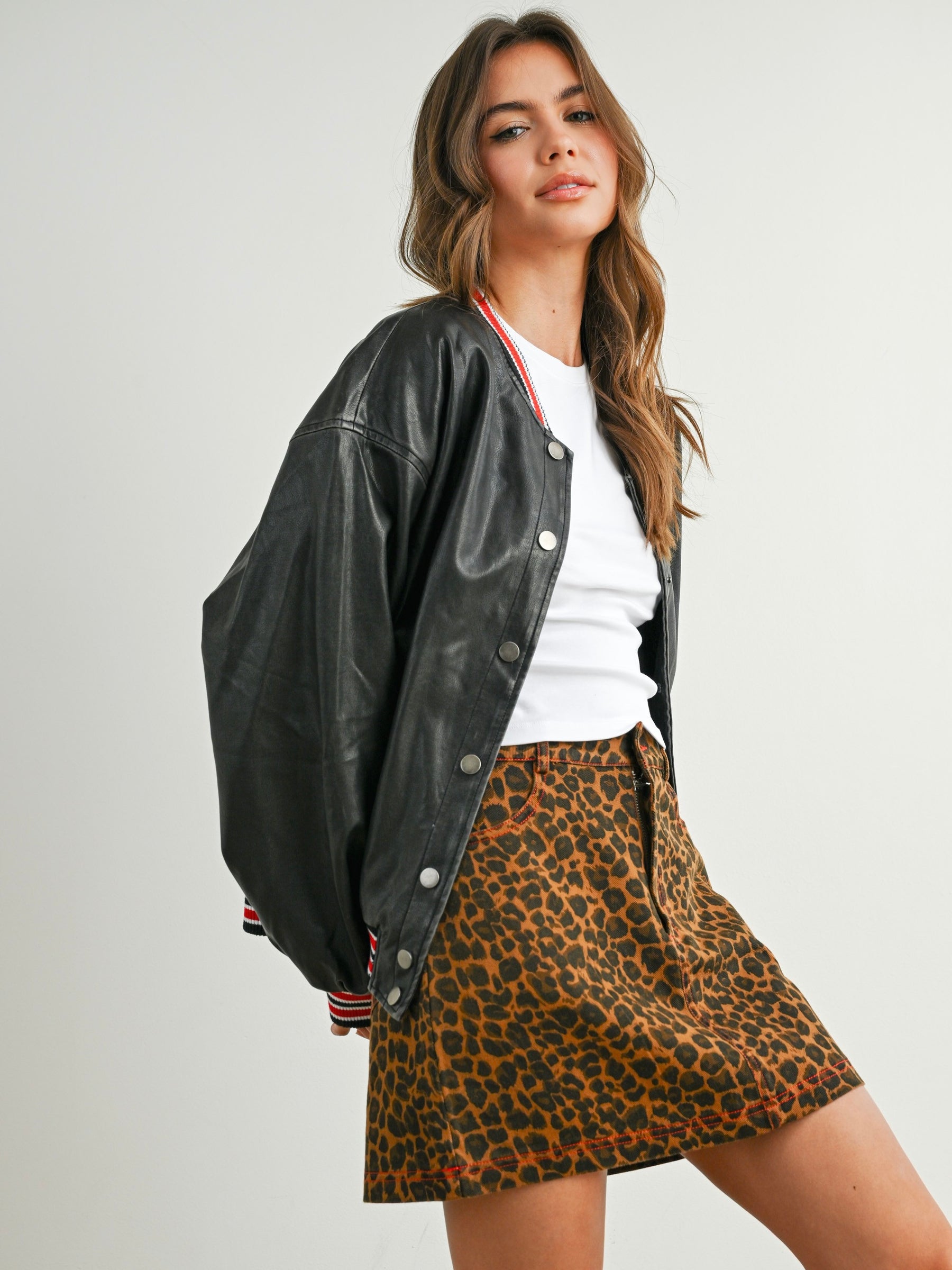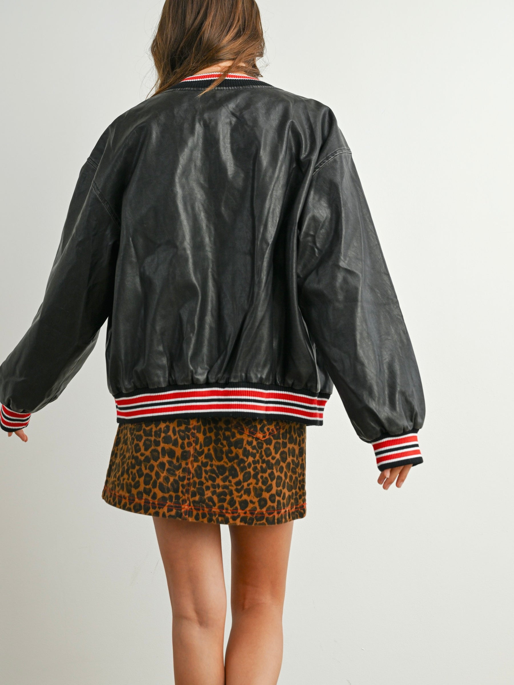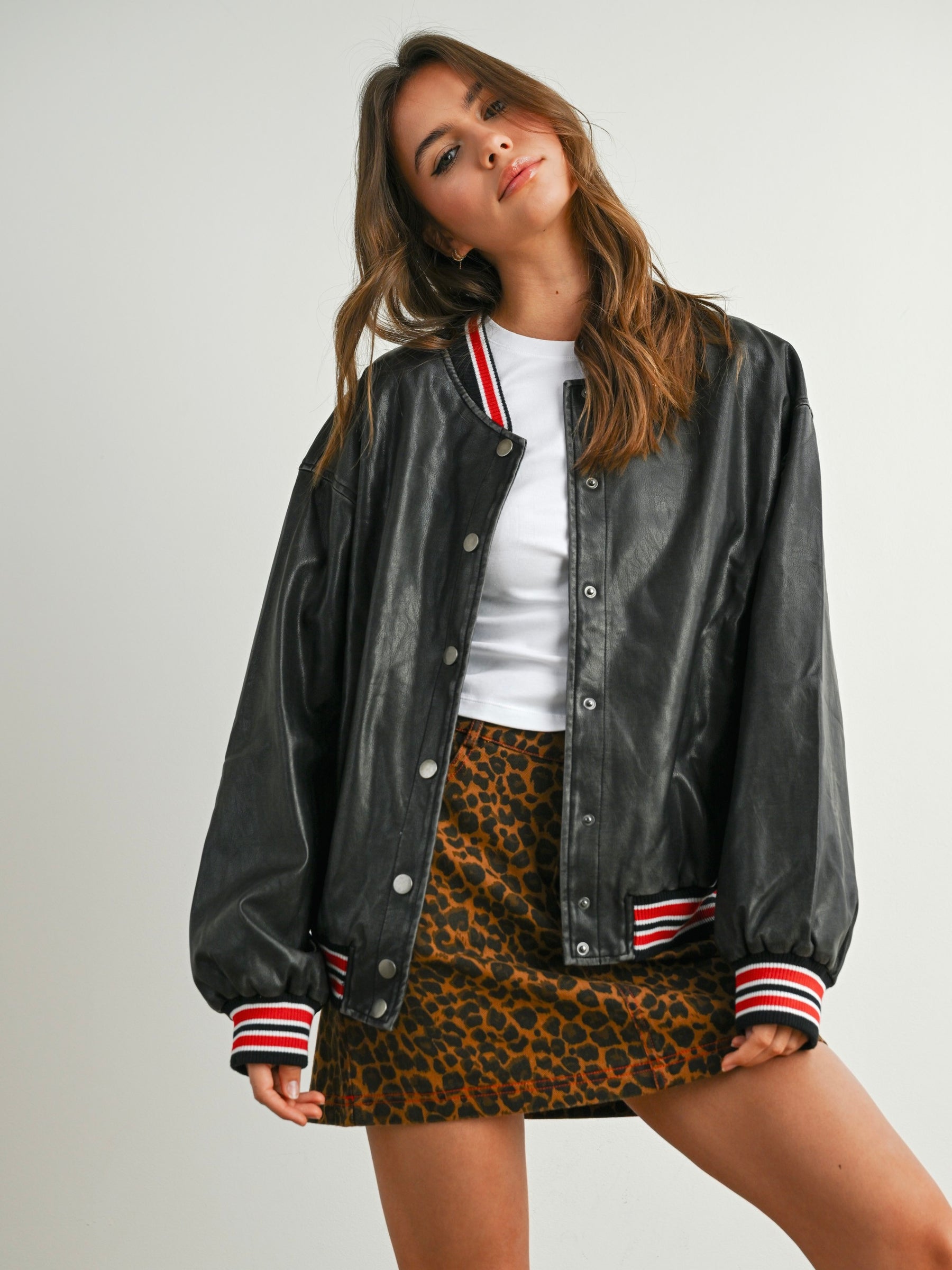 This sporty Varsity Bomber Jacket brings classic varsity vibes with bold contrast stripes and a timeless bomber shape. The snap-front design makes it easy to layer, while the sleek finish adds a modern twist. Perfect for throwing on with denim or joggers when you want an effortlessly fun look.