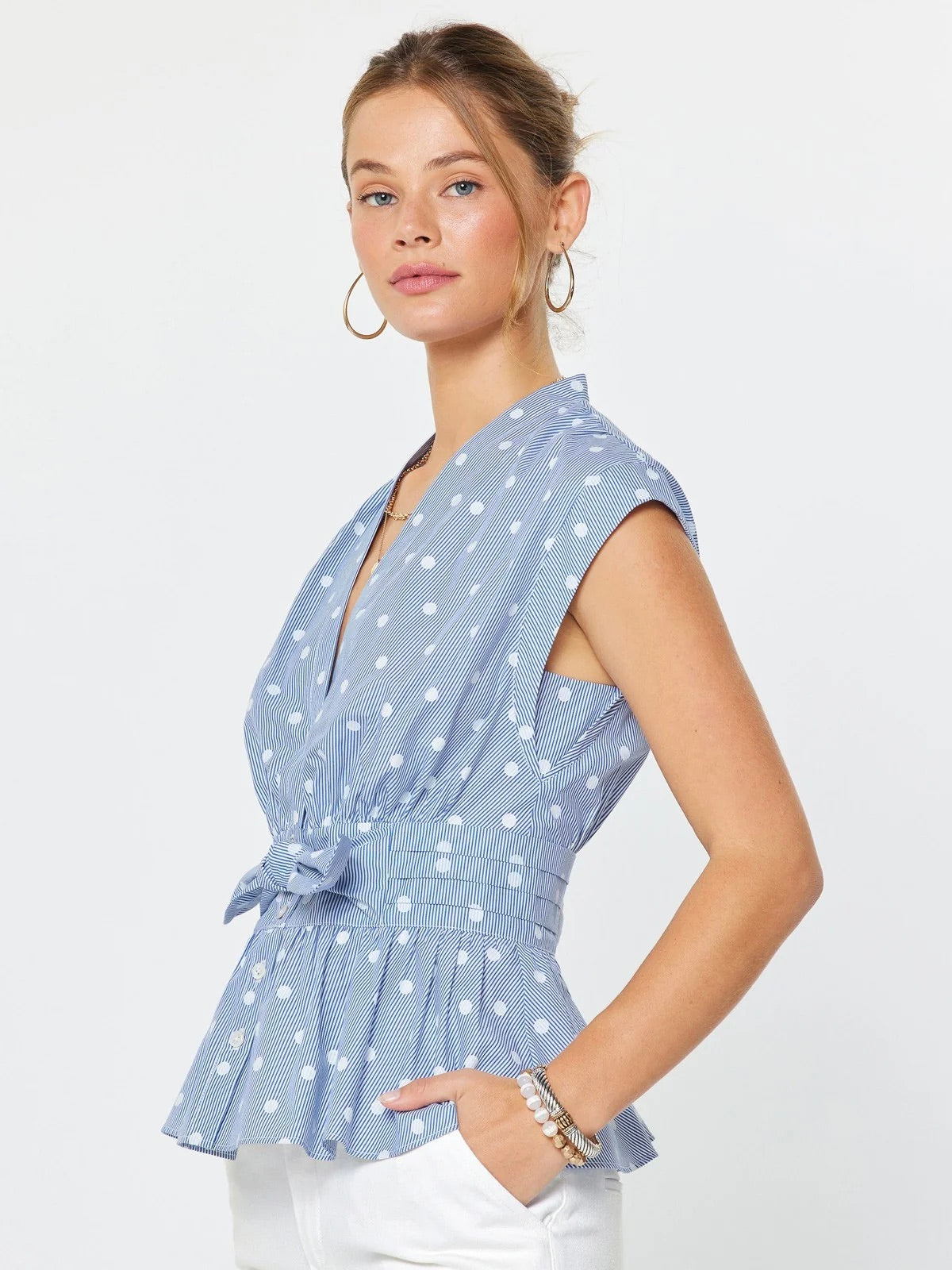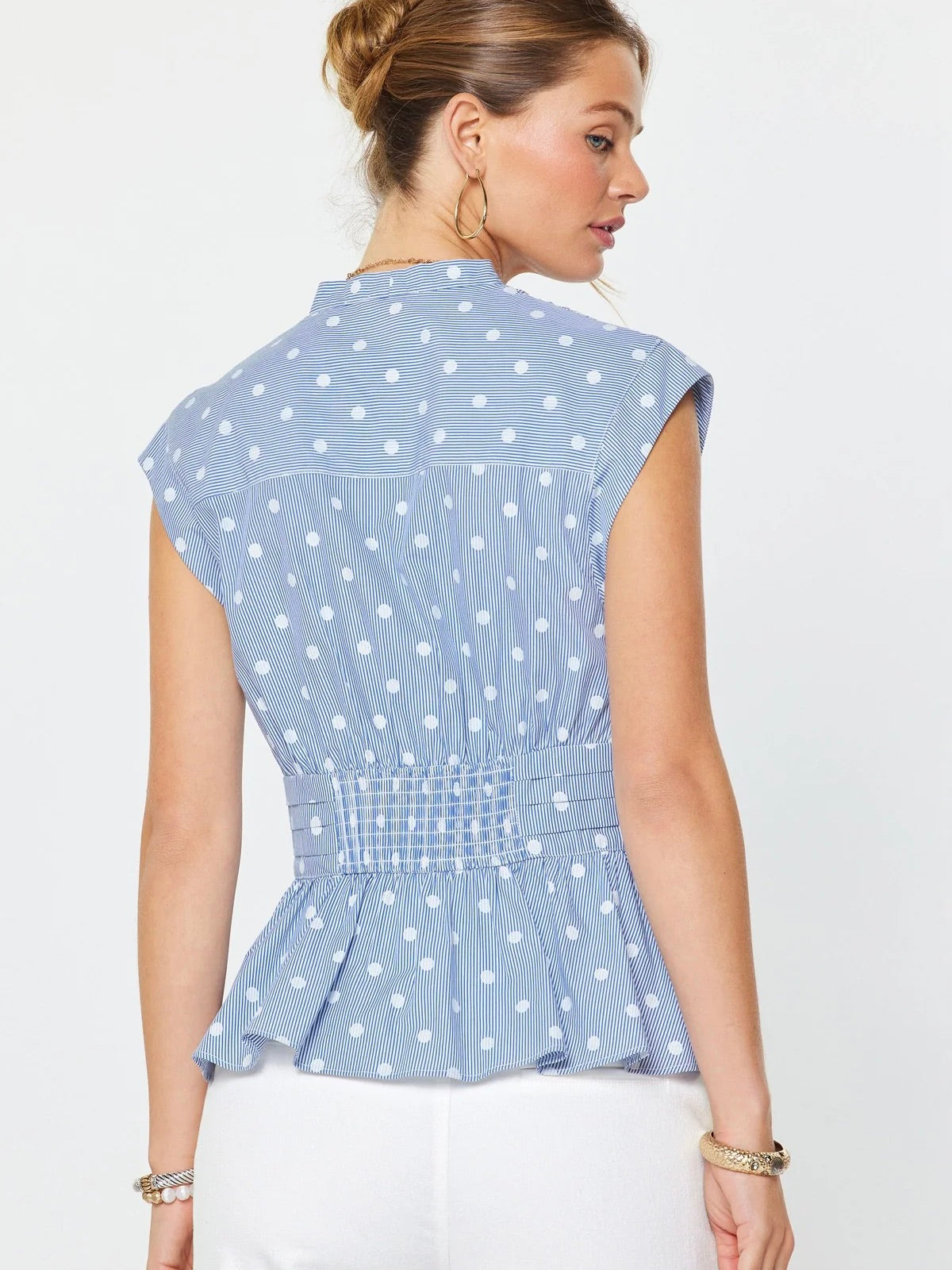 The Striped Polka Dot Peplum Blouse is a playful mix of prints with a flirty, feminine shape. Designed with a V neckline and cap short sleeves, it keeps things light and easy up top. The tie waist bow and smocked back create a flattering, flexible fit, while the peplum ruffle hem adds the perfect finishing touch. It’s a standout piece that instantly brings personality to any outfit.