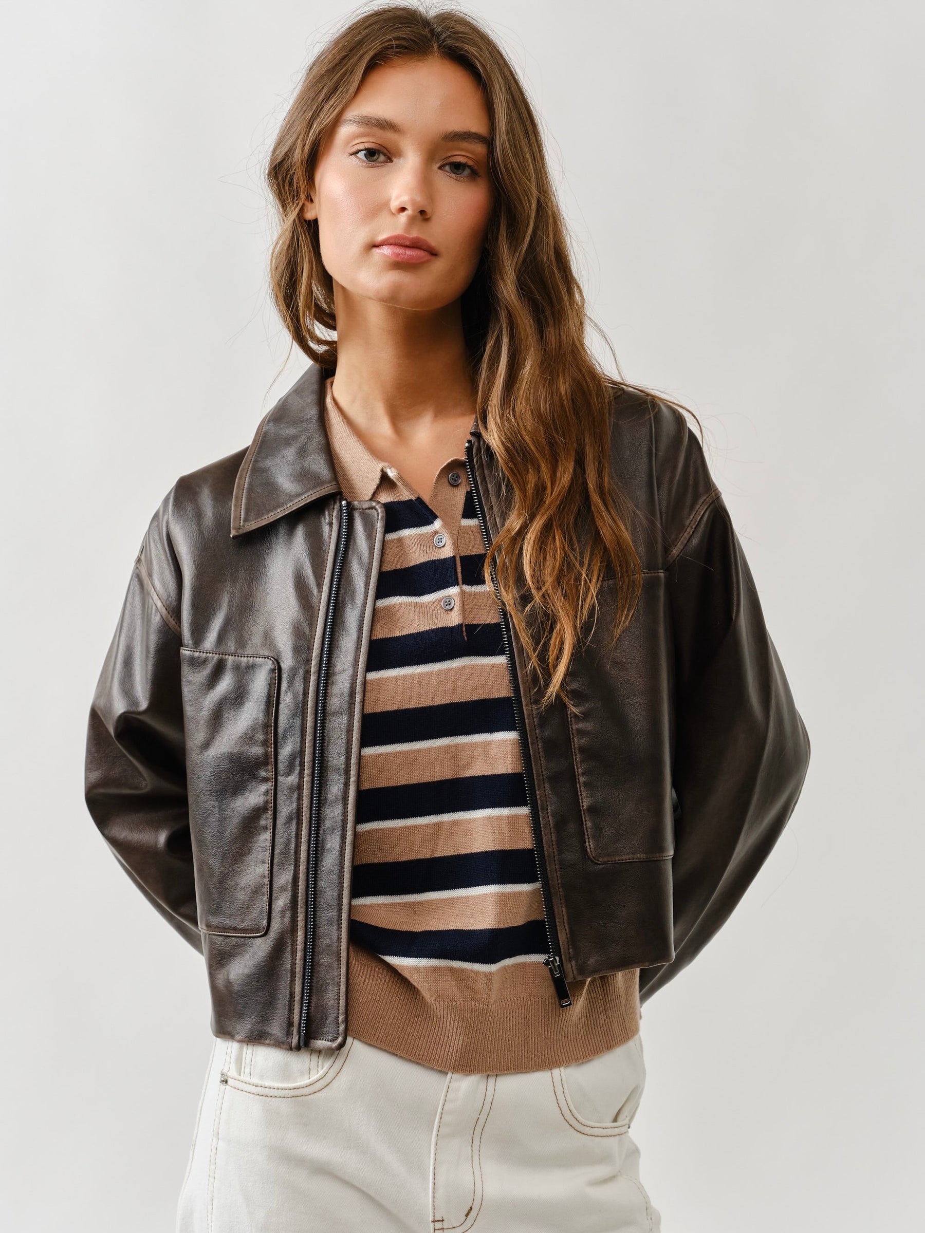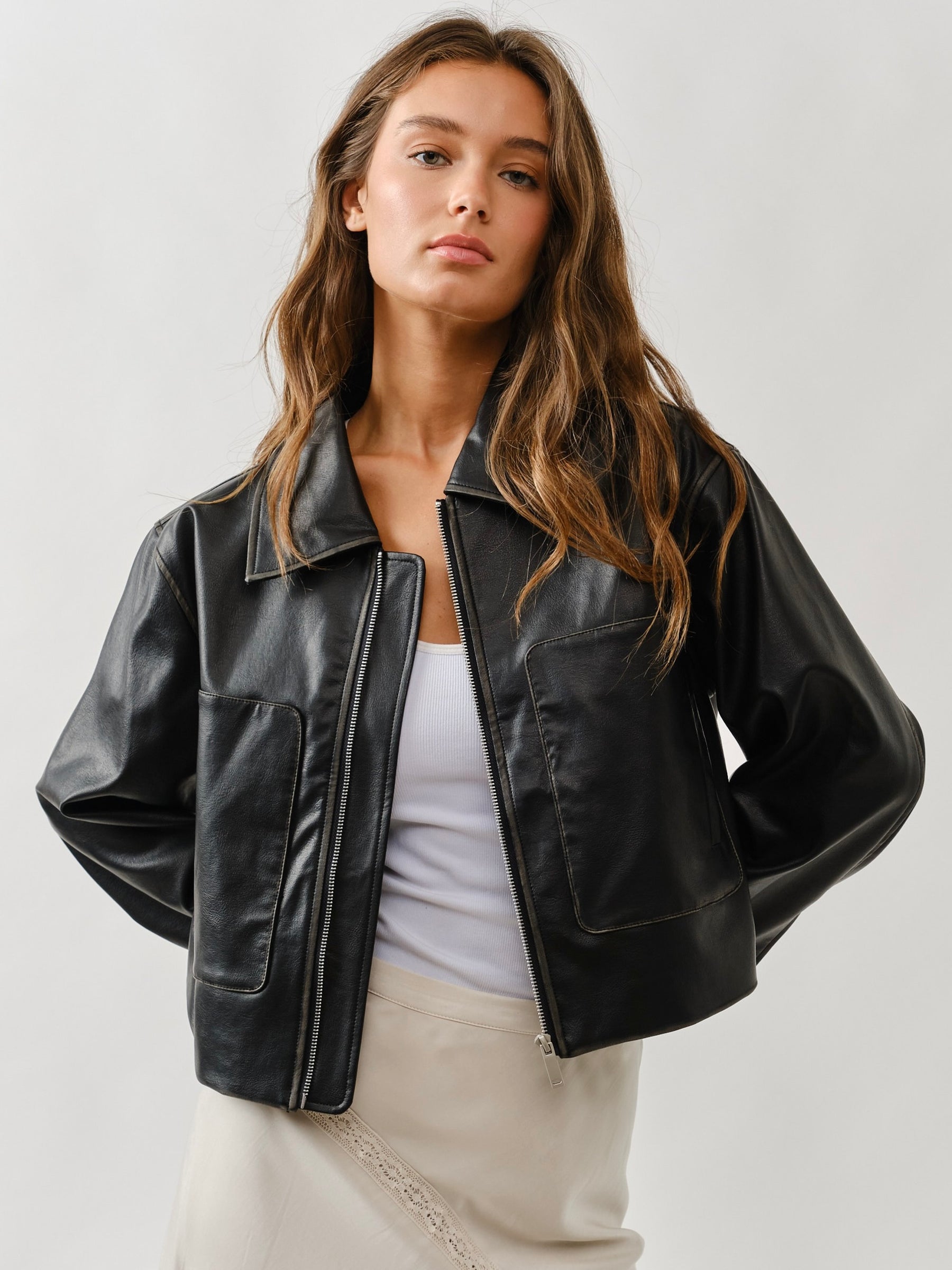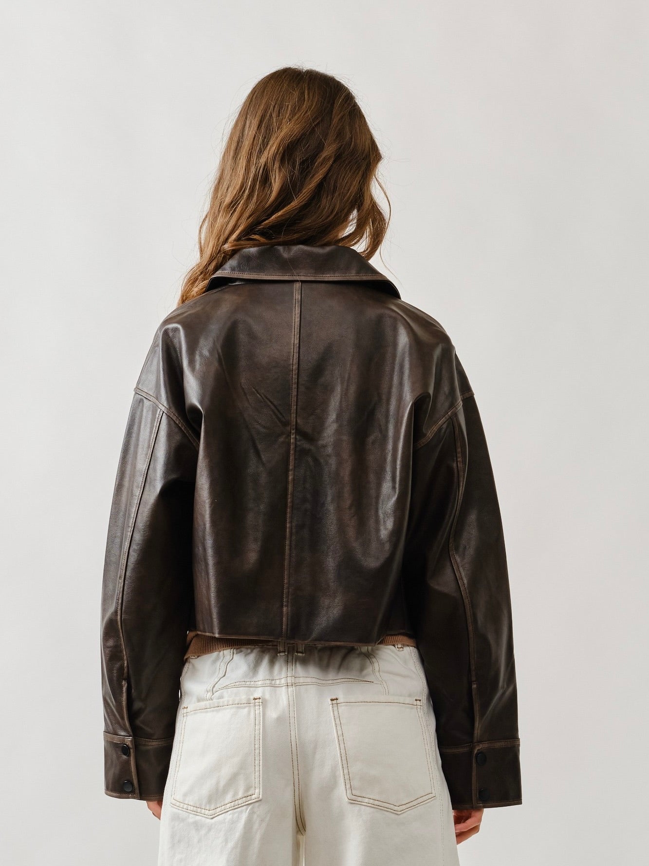 Crafted from faux leather with a vintage-washed finish, this timeless jacket brings a rugged yet refined edge to your collection. Designed with a relaxed silhouette, it features practical side pockets, a zip-front closure, and subtle distressing for that perfectly worn-in look. Effortlessly cool.