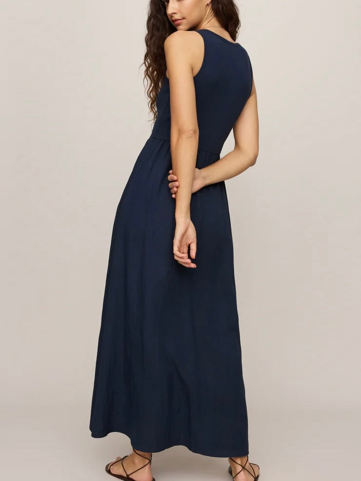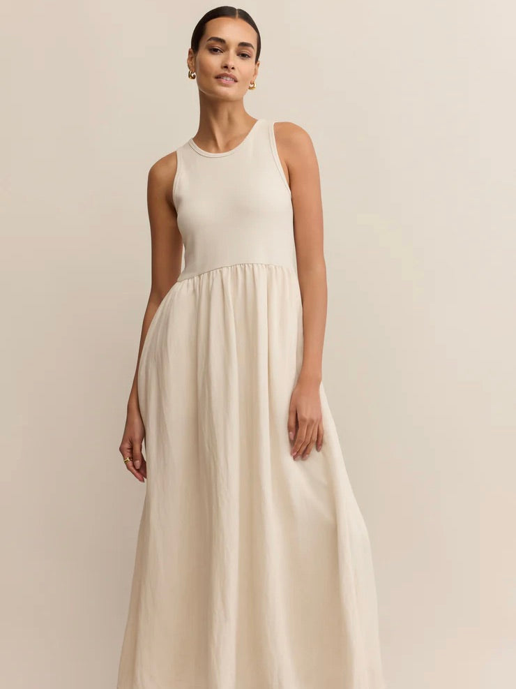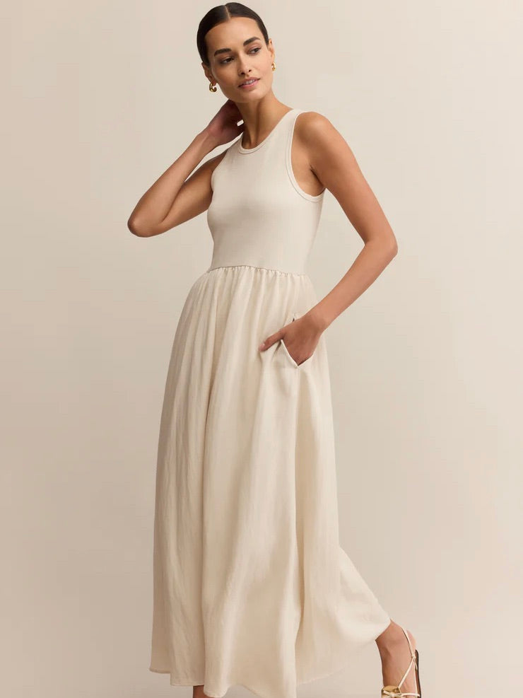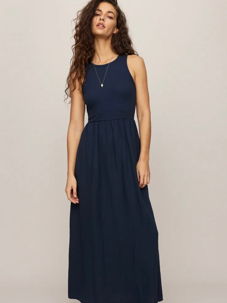 The Charlotte Midi Dress has that perfect mix of fitted and airy. The ribbed cotton modal bodice hugs just right, while the textured rayon skirt flows with every step. Finished with a high neckline, sleeveless shape, and hidden pockets because yes, we’re keeping it functional too.