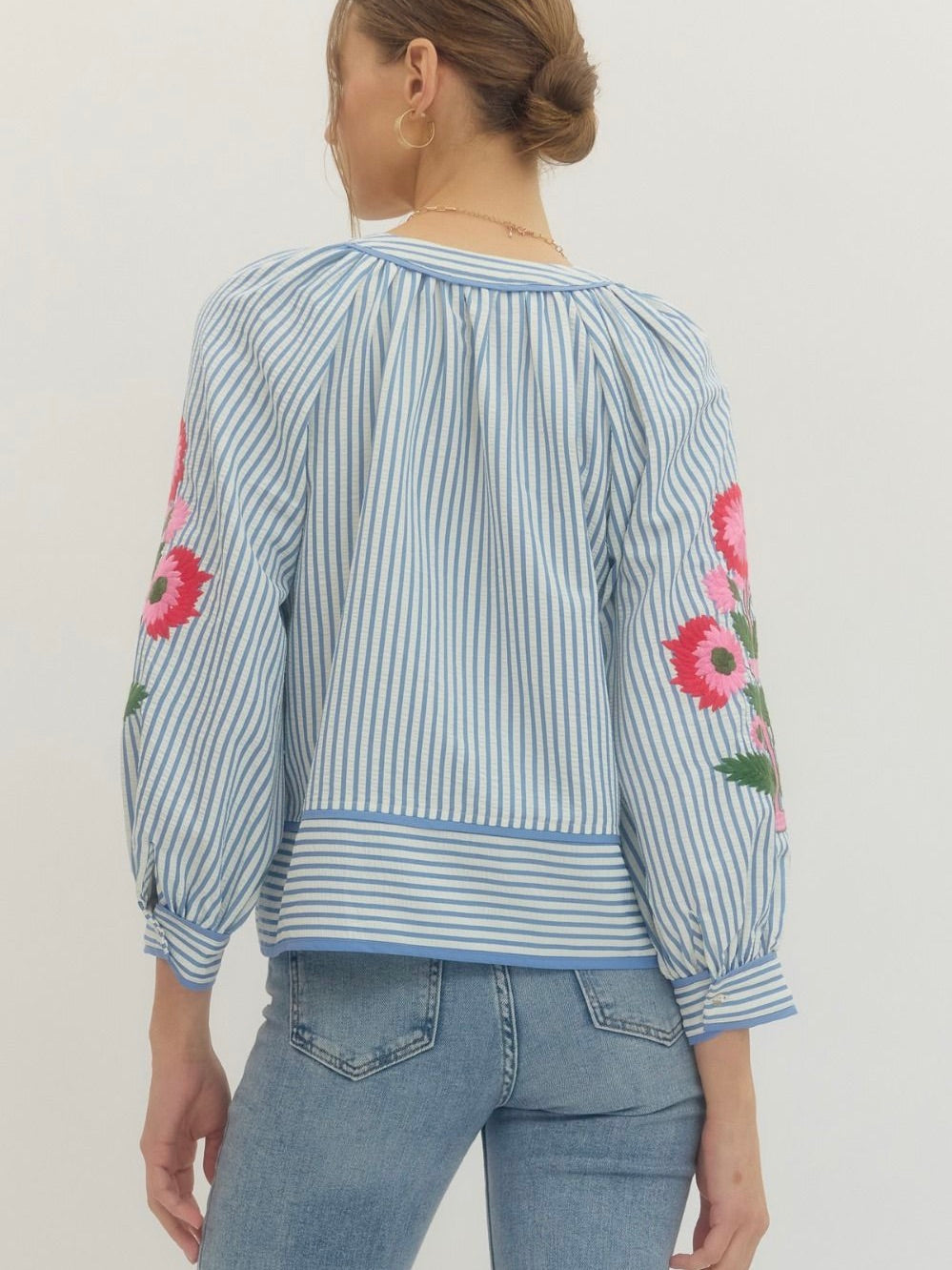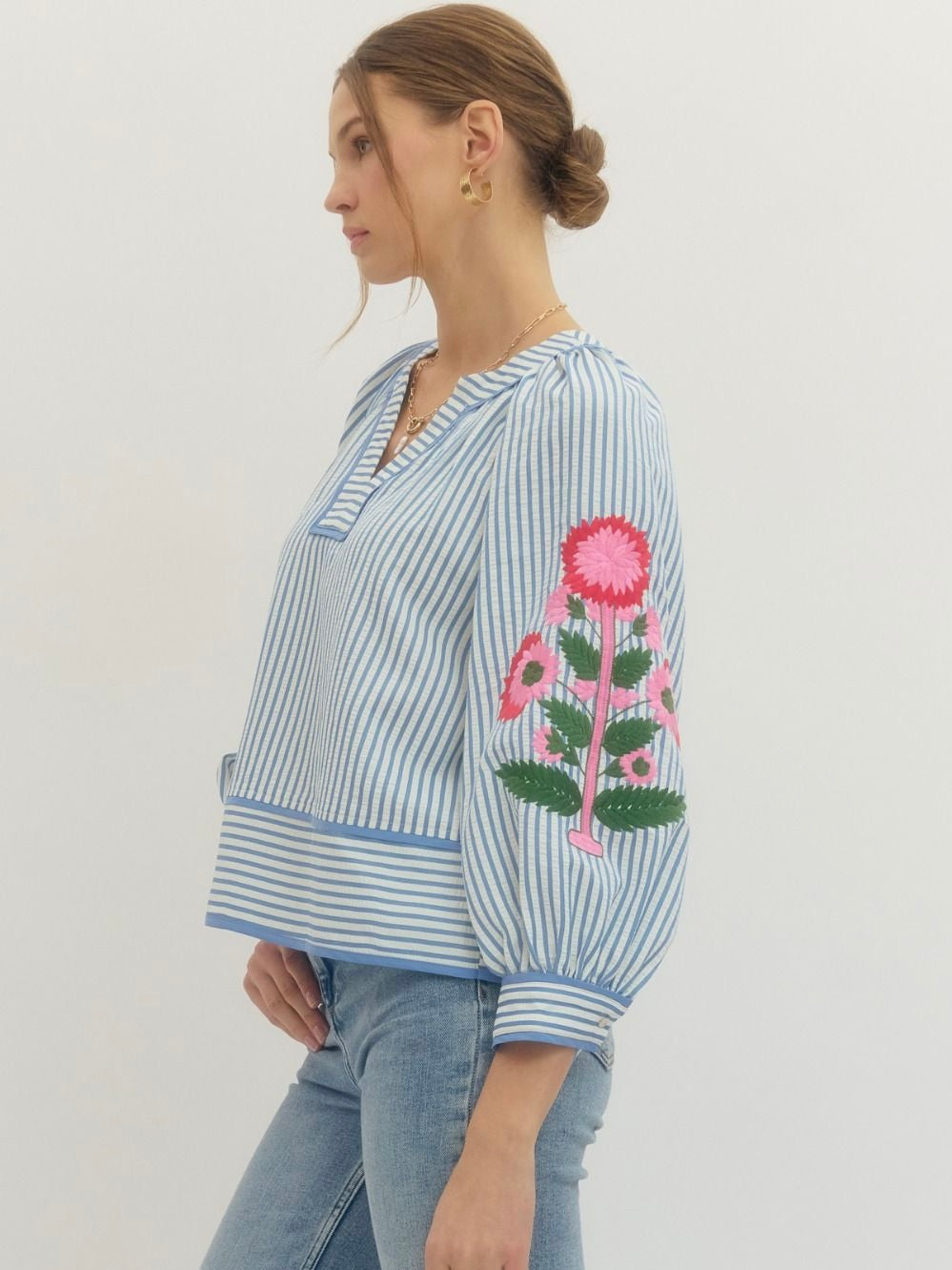 The Hampton Garden Top is a breath of fresh air for your everyday lineup. Featuring a flattering V neckline, pretty floral embroidery, and contrast binding for a pop of detail, it’s full of charm without trying too hard. The 3/4 sleeves with button cuffs make it easy to wear from day to night—perfect with denim, white pants, or your favorite skirt for an instant mood boost. 🌸