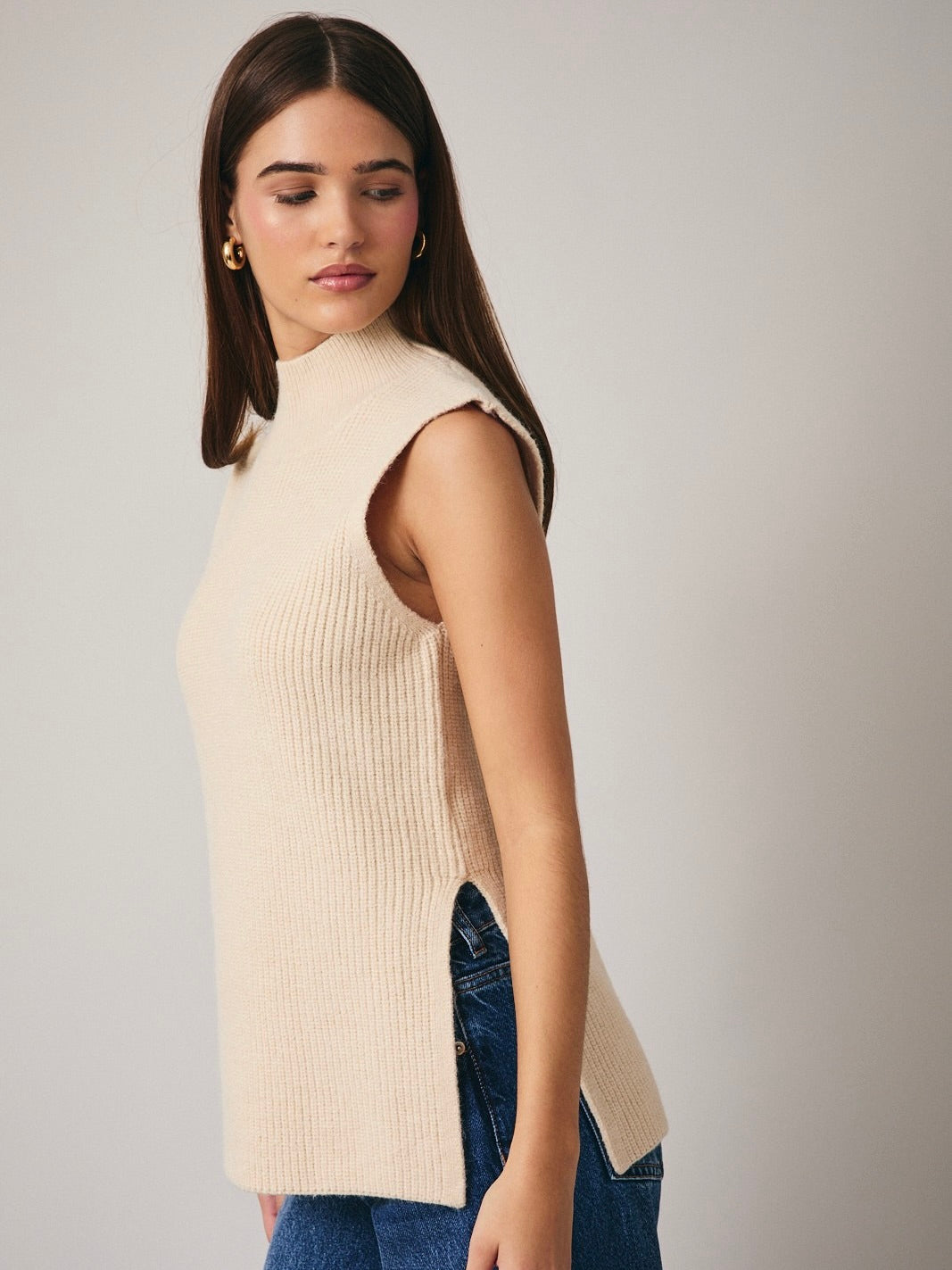 The Reese Sleeveless Sweater is that easy, throw-on-and-look-amazing piece your wardrobe’s been waiting for. With a chic mock neckline, ribbed texture, and breezy side slits, it delivers polished comfort all day long. Layer it, style it solo, dress it up or down—Reese always understands the assignment.