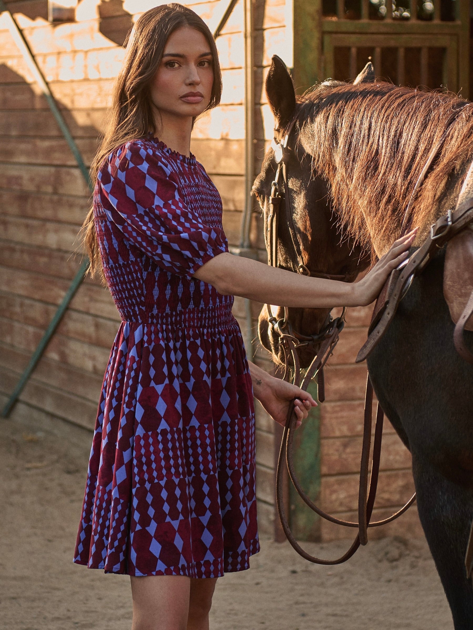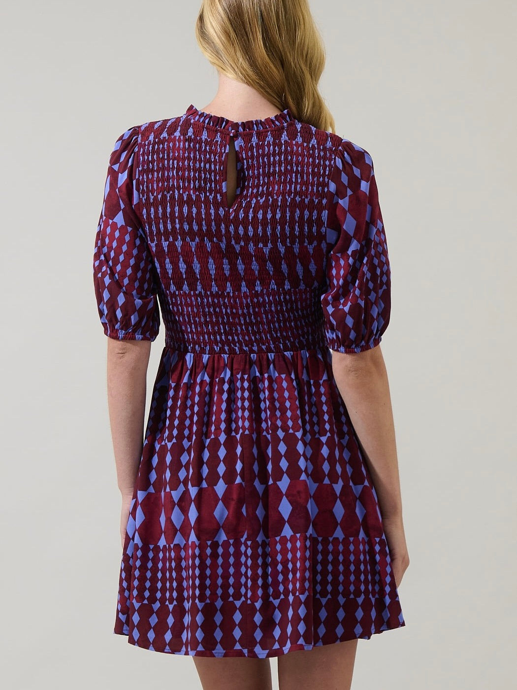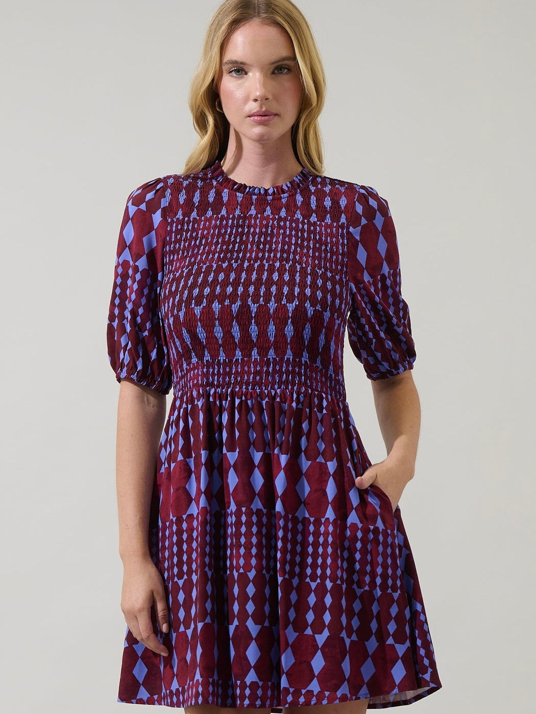 The Ramsay Abstract Dress is made to turn heads the moment you walk in. Featuring a bold diamond geometric print, sweet puff sleeves, and a softly ruffled neckline, this mini strikes the perfect balance between playful and polished. The smocked waist creates a flattering shape, while side pockets add everyday ease. It’s your go-to dress for letting your outfit do all the talking—just add block heels, a mini bag, and statement earrings.