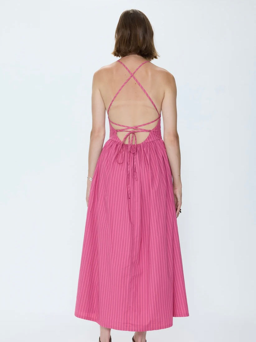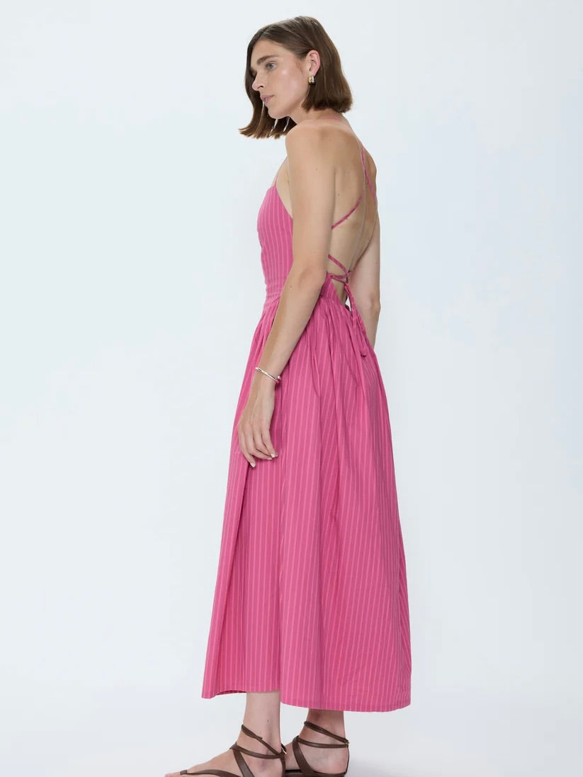 Sadee brings modern ease to warm-weather dressing with a fitted bodice, halter tie, and open back that adds effortless appeal to a seasonal staple. Vertical magenta stripes elongate the frame, while subtle seaming releases into a softly voluminous skirt for fluid movement. Designed to hit just above the ankles, it delivers a flattering, balanced proportion.