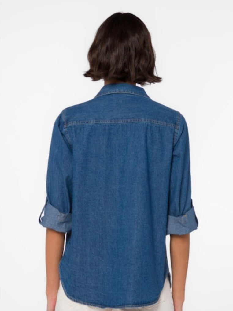 The Talma Top is a relaxed, denim-ready essential with a laid-back vibe. Made from a soft cotton-hemp blend, it features a collared neckline, chest pockets, and long sleeves for everyday wear. The shirttail hem gives it an easy, tossed-over-your-jeans look, making it perfect for casual weekends or layering like a lightweight denim jacket.