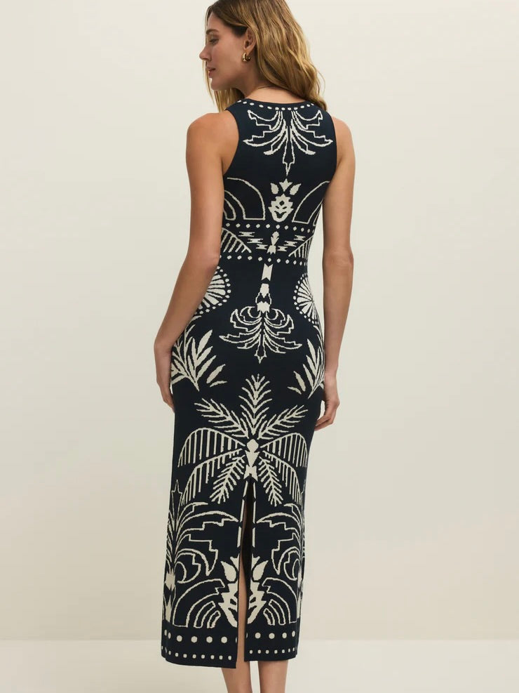 Soft sweater knit meets a sleeveless midi silhouette with a palm print that feels like vacation. Finished with a back slit and midweight feel, it’s made for breezy nights and easy travel