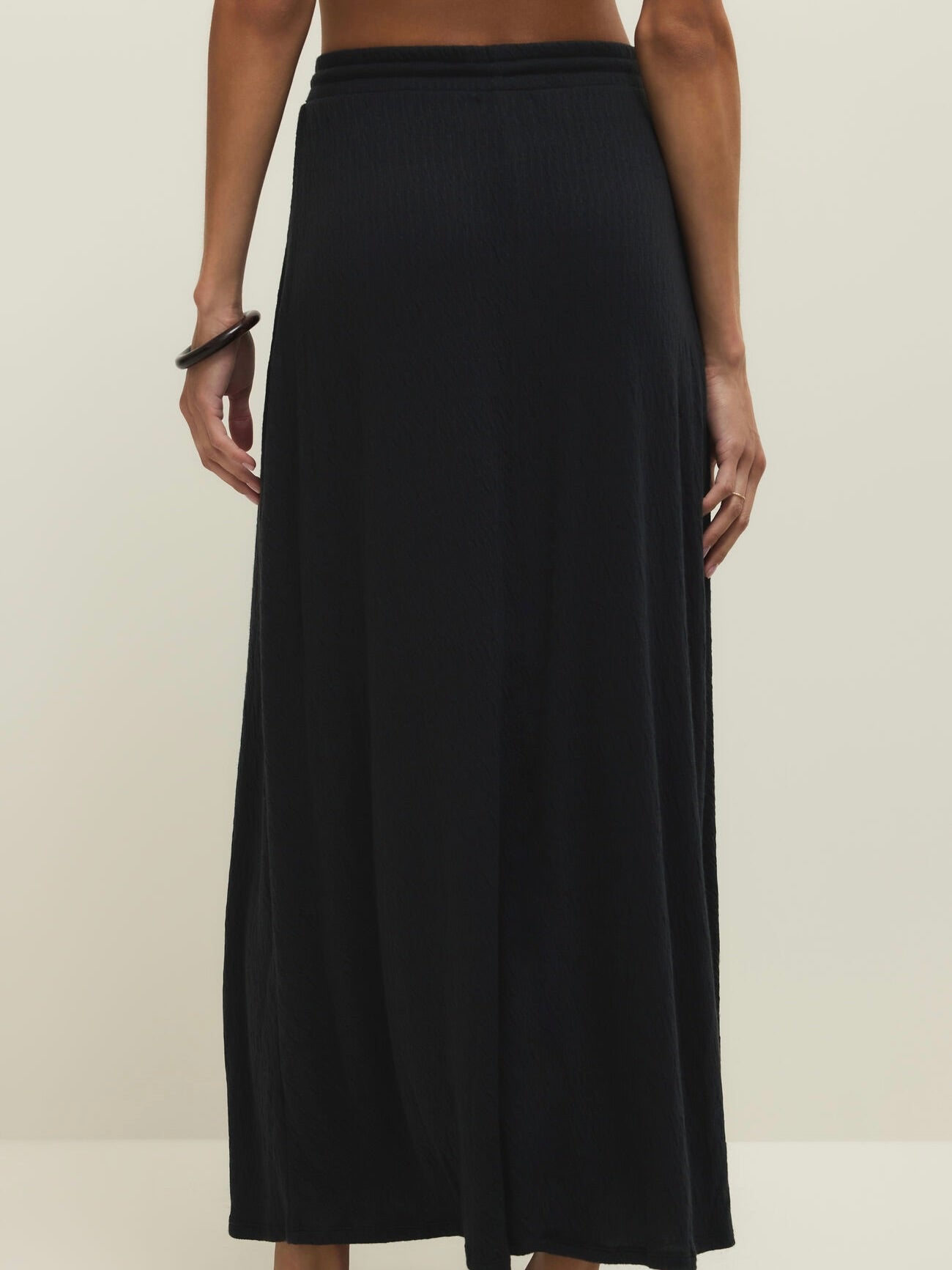 Made in our textured puckered knit, this maxi skirt features an elastic tie waist and a back slit that adds movement and ease.