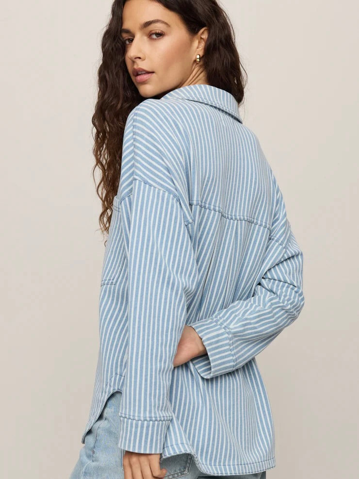 Designed in signature Knit Denim French Terry, this jacket features subtle stripes and a relaxed, lived-in feel. The mineral wash finish adds depth and softness, creating the perfect everyday layer that pairs with everything.
