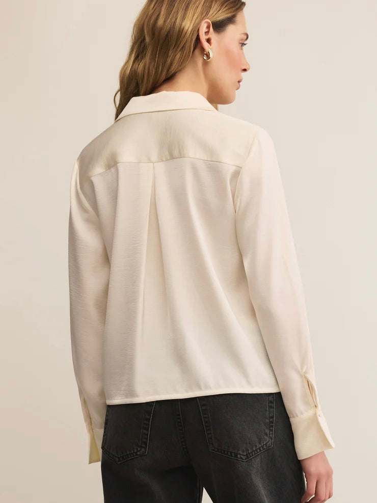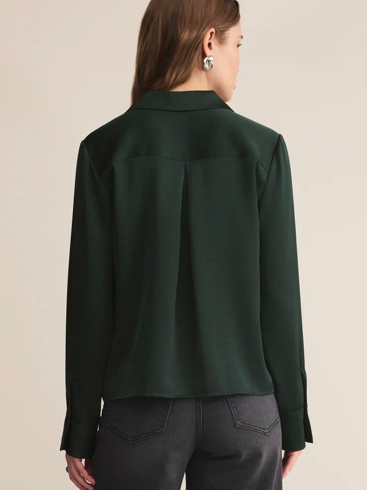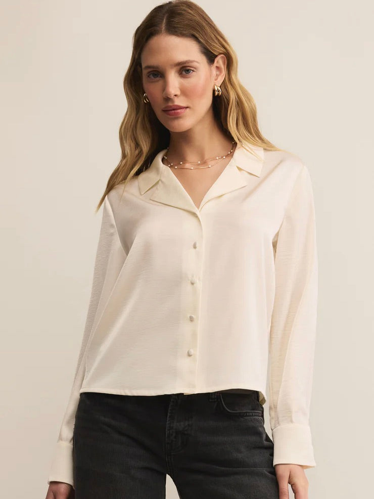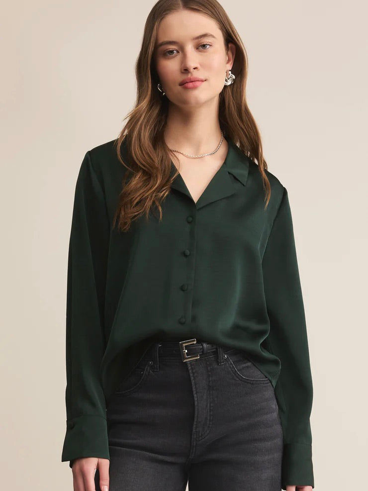 This luxe satin top offers a relaxed fit with a collared neckline and button-front design. Its fluid drape and understated sheen make it a versatile staple for workdays or nights out.