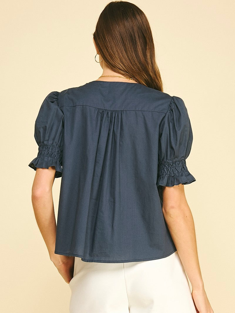 The Andover Top is a sweet, easygoing cotton staple with thoughtful details. Featuring a flattering V neckline, short puff sleeves, and a button-down front, it’s finished with soft shirring for added texture and shape. Perfect for everyday wear, this top pairs effortlessly with denim, skirts, or shorts for a fresh, put-together look.