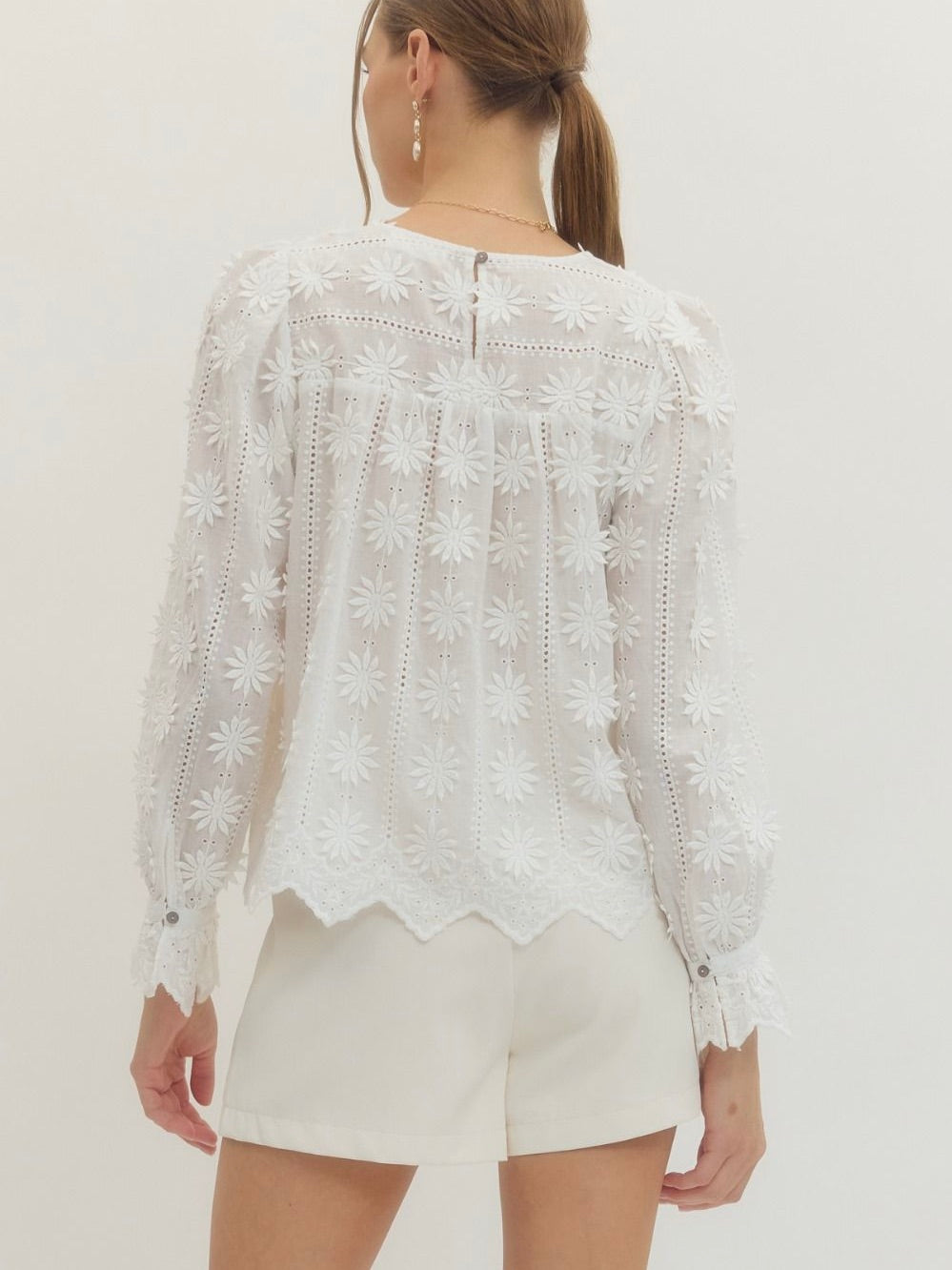 Soft, sweet, and a little bit special, the Daisy Fields Top brings texture and charm with its raised floral motif. Finished with delicate buttons at the back and cuffs, it’s an easy piece that feels thoughtful without trying too hard.