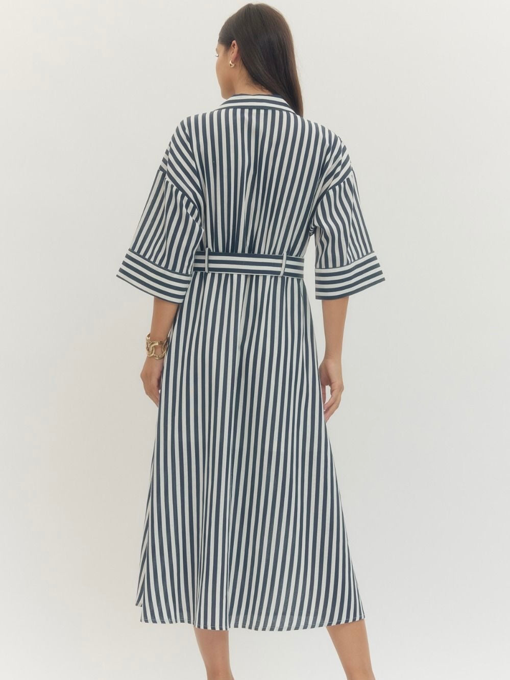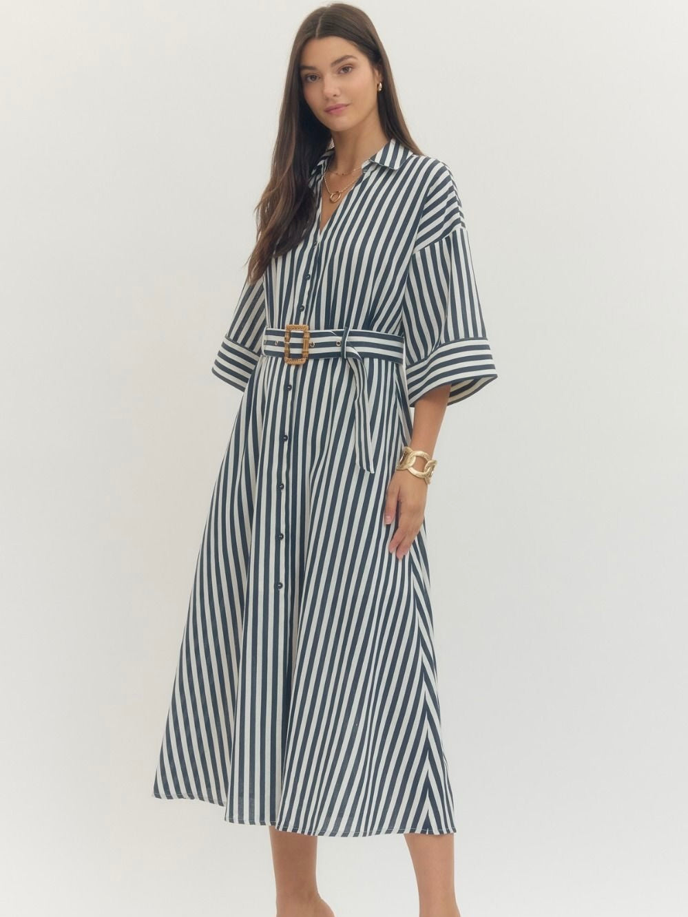 The Davis Dress is a breezy, modern take on the classic shirt dress. Crafted from a soft linen-blend fabric, it features a collared button-down front and a midi length for easy, everyday wear. A belted waist adds shape, while side pockets and full lining keep it practical and polished—perfect for workdays or weekend outings.