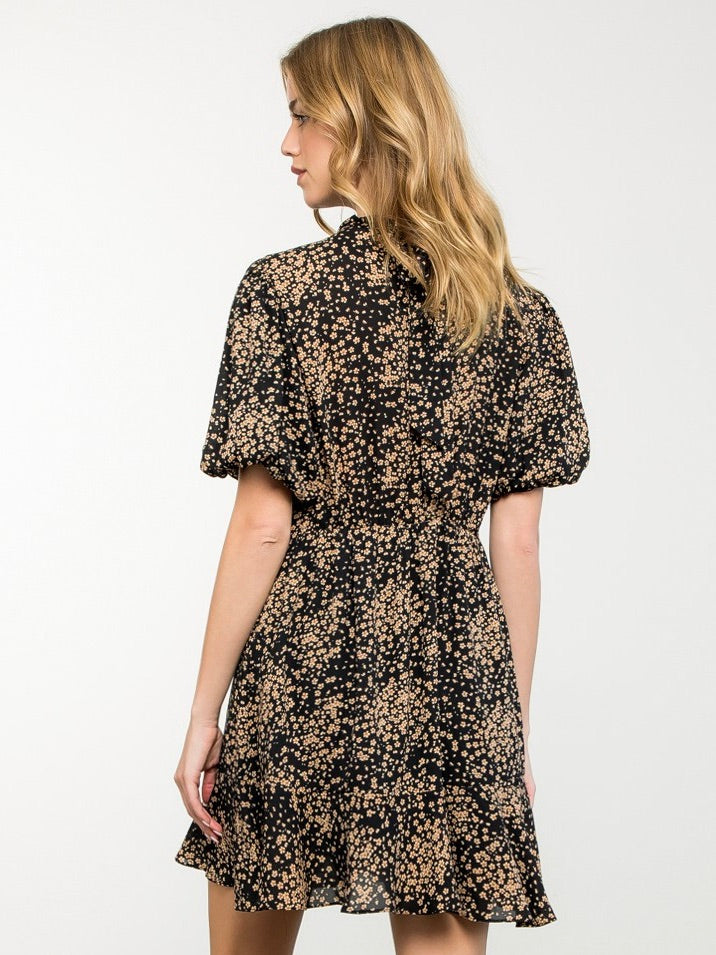 Bring a little whimsy to your wardrobe with this Ditsy Flower Print Dress. The mock neckline and short puff sleeves keep things sweet and flirty, while the above-the-knee length adds a fun, easygoing vibe. A back neck tie detail adds a charming finishing touch—perfect for twirling through sunny days or dressing up for a casual night out.