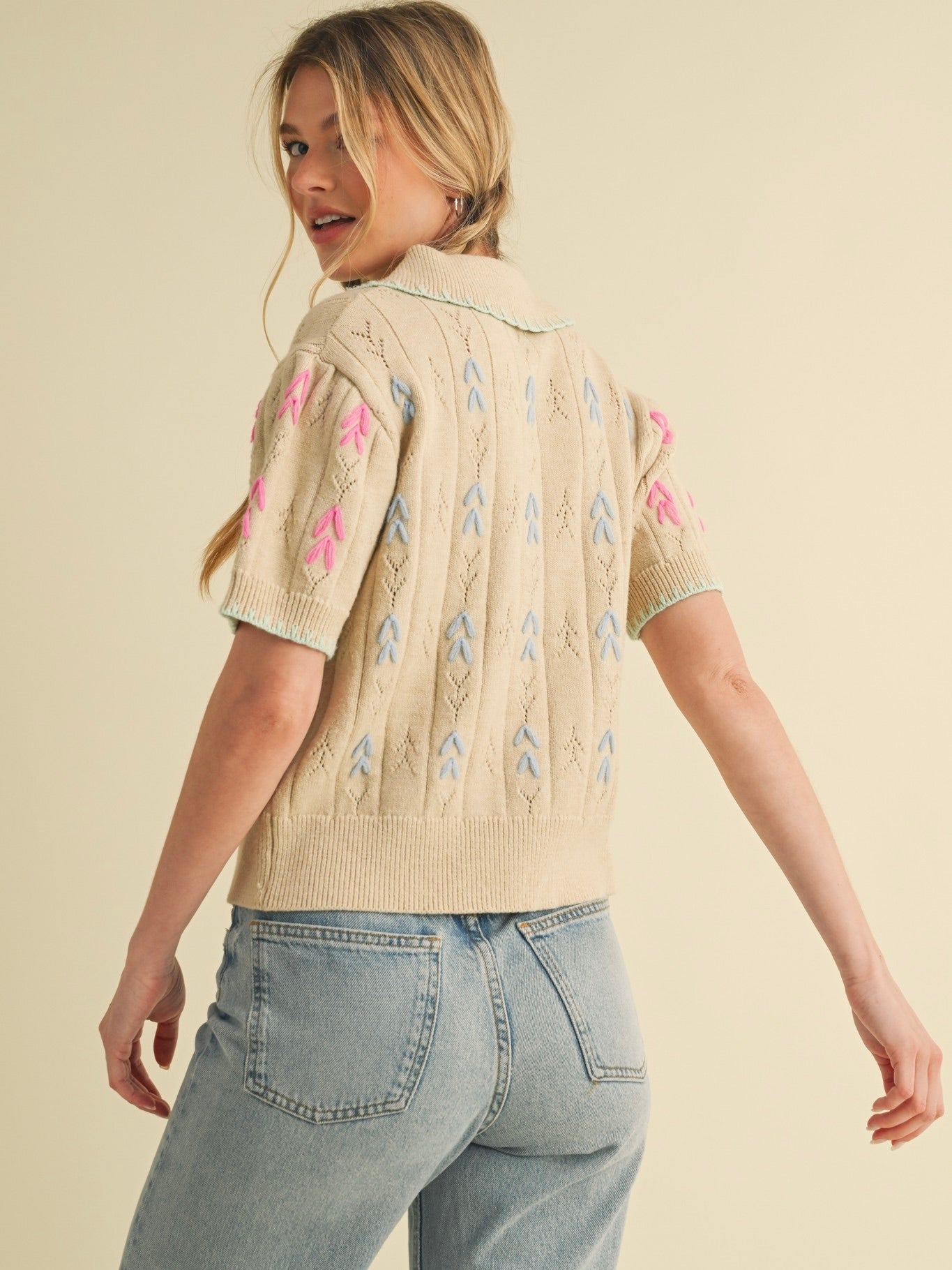 Charming and crafted with care, this collared sweater features delicate hand embroidery over a breathable pointelle knit. With short sleeves, a button-down front, and ribbed trim, it’s the perfect mix of sweet, detailed, and effortlessly wearable.