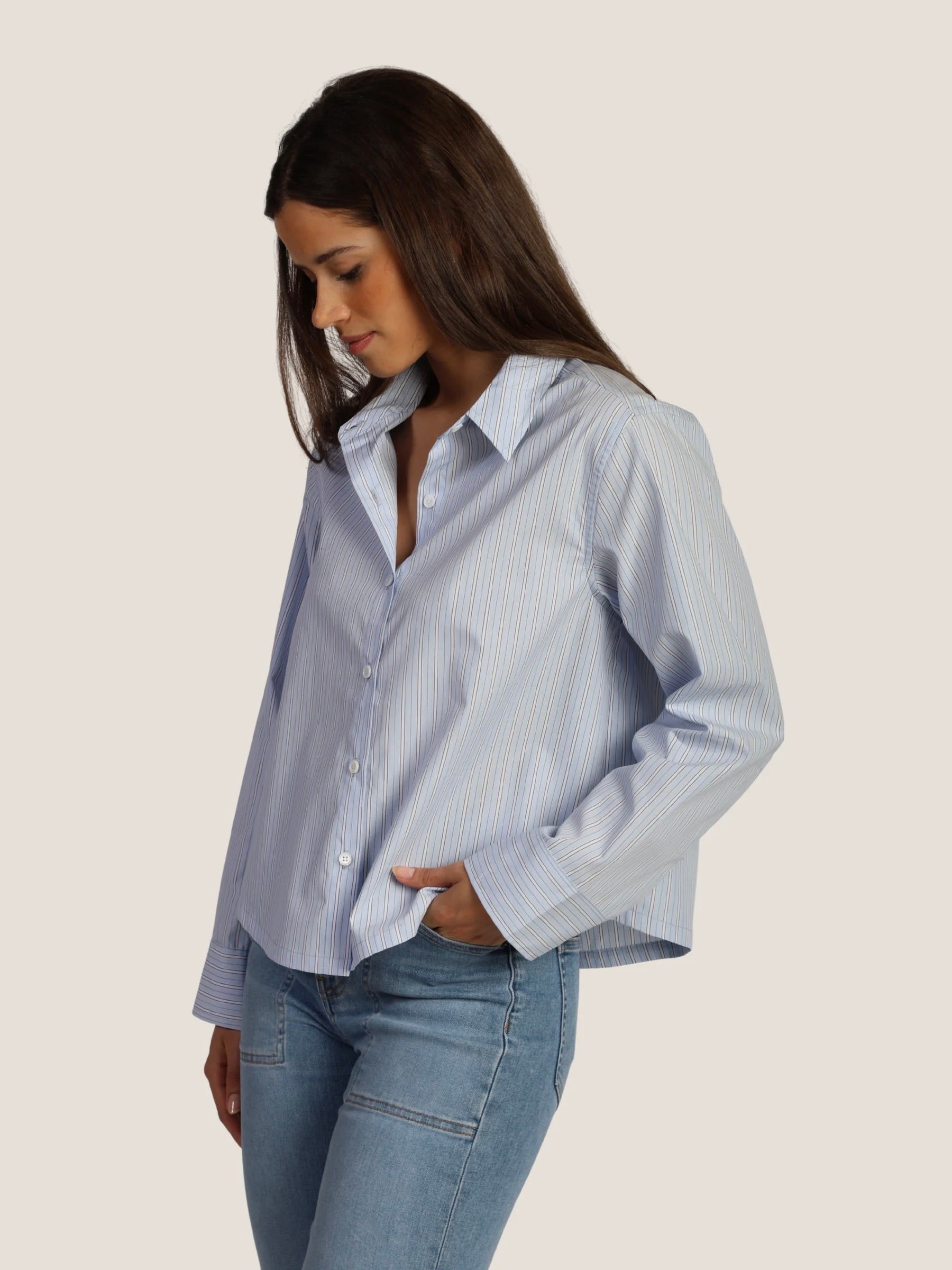 The Hi-Lo Modern Shirt is a fresh take on a timeless classic. Made from 100% cotton, it’s crisp, breathable, and easy to style year-round. The collared neckline and button-down front keep it polished, while the hi/low hem adds a contemporary edge and extra coverage in the back. It’s perfect tucked, layered, or worn loose for that effortlessly put-together look.