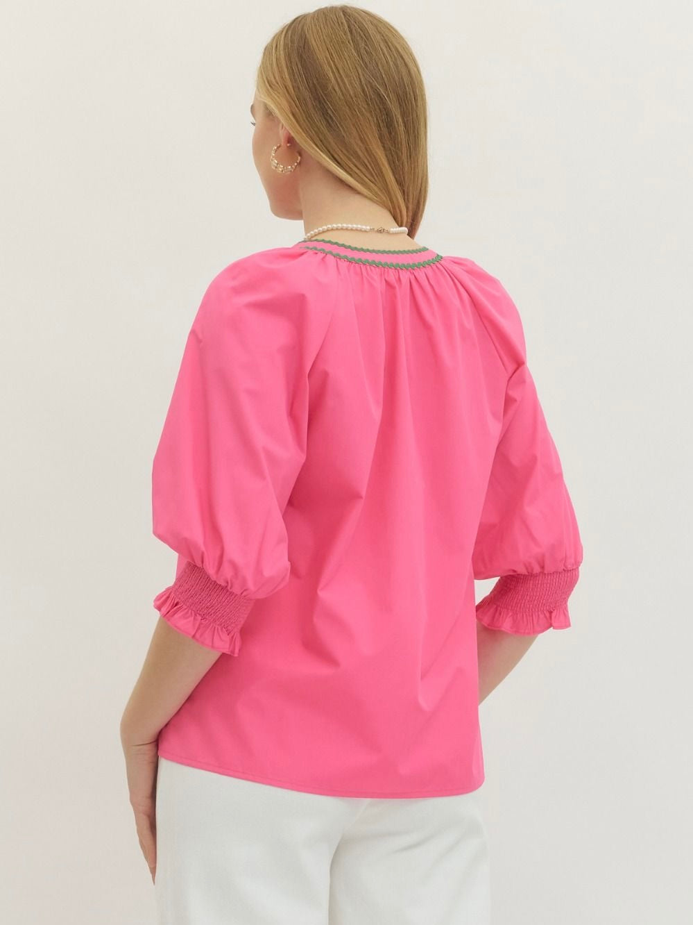 The Ivy Top brings an easy, feminine touch to everyday dressing with a bold twist. Designed in vibrant hot pink with playful green embroidered detail, it features a split neckline and soft puff sleeves for a flattering shape. Lightweight and effortless, it’s the kind of top that instantly brightens your look—no extra styling required.