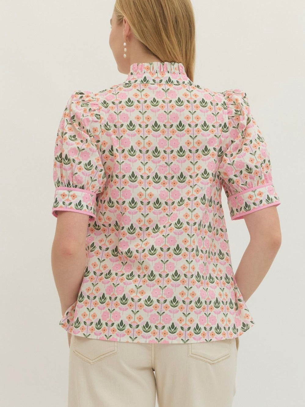 The Kellan Top is a little burst of happy you can wear. Short puff sleeves and a button-down front keep it playful and easygoing. The pink floral print with contrast binding adds a sweet, cheerful pop. Pair it with your favorite jeans or skirt and you’re ready to turn any day into a style moment.