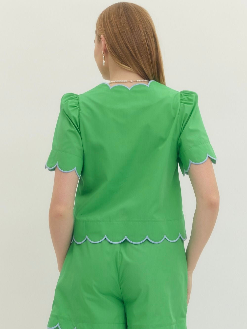 The Prima Top is all about sweet little details that make an outfit pop. Contrast scallop trim adds a playful touch to the classic round neckline and button-down front. Pair it with crisp white denim or a breezy skirt for an effortlessly cheerful look.ย