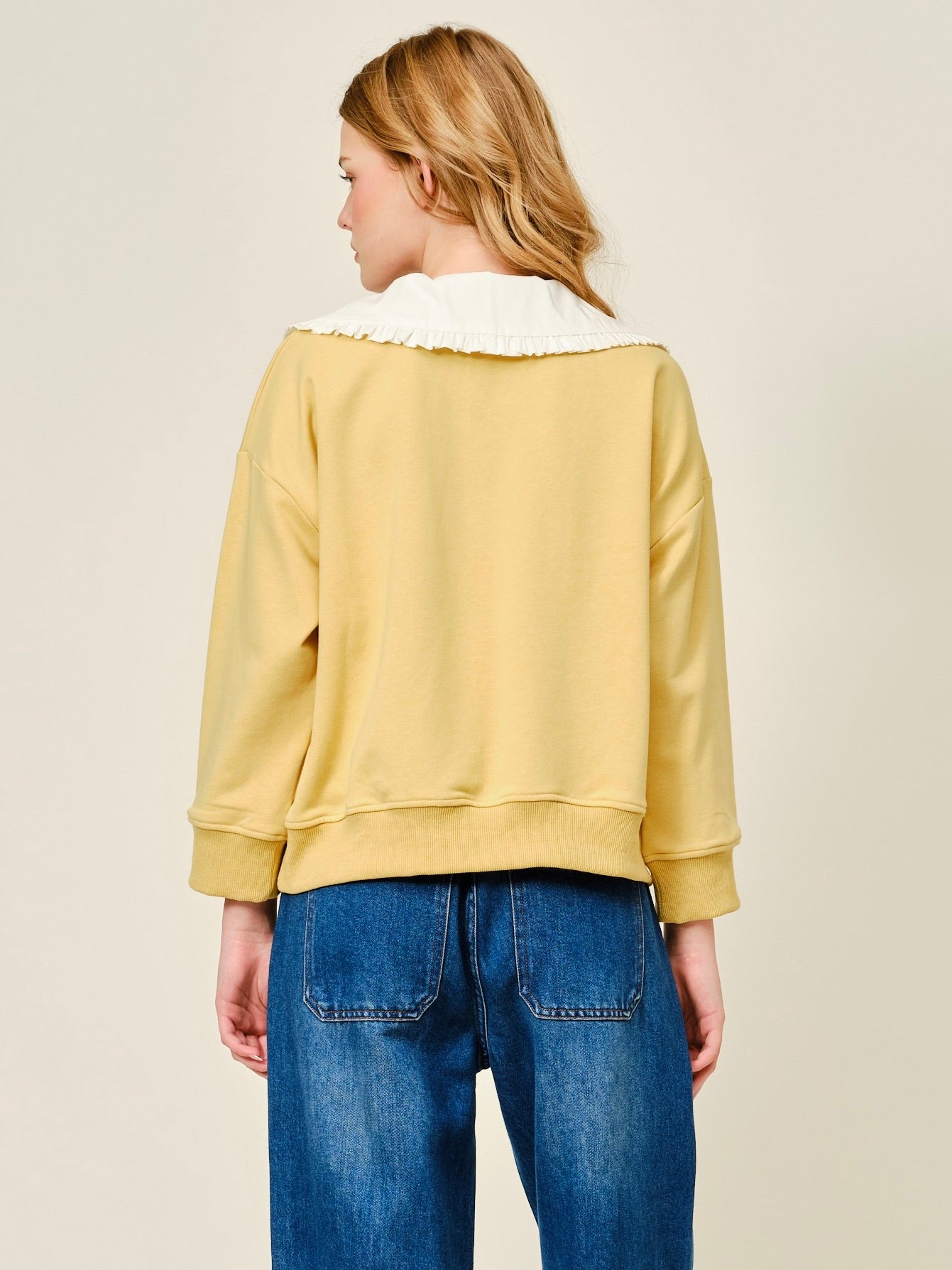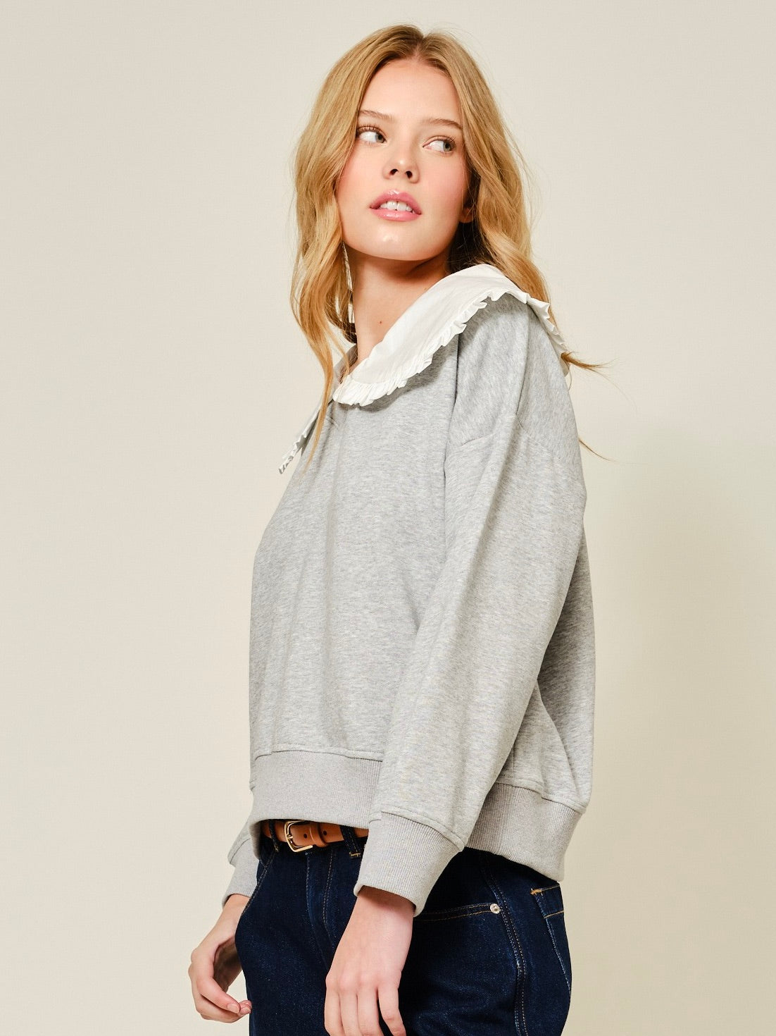 Cute meets comfy in this removable Peter Pan Collar Sweatshirt. The relaxed fit and dropped shoulders keep it laid-back, while the sweet collar lets you switch up the vibe whenever you want. Finished with a banded hem, it’s the kind of cozy piece that feels extra special without trying too hard.