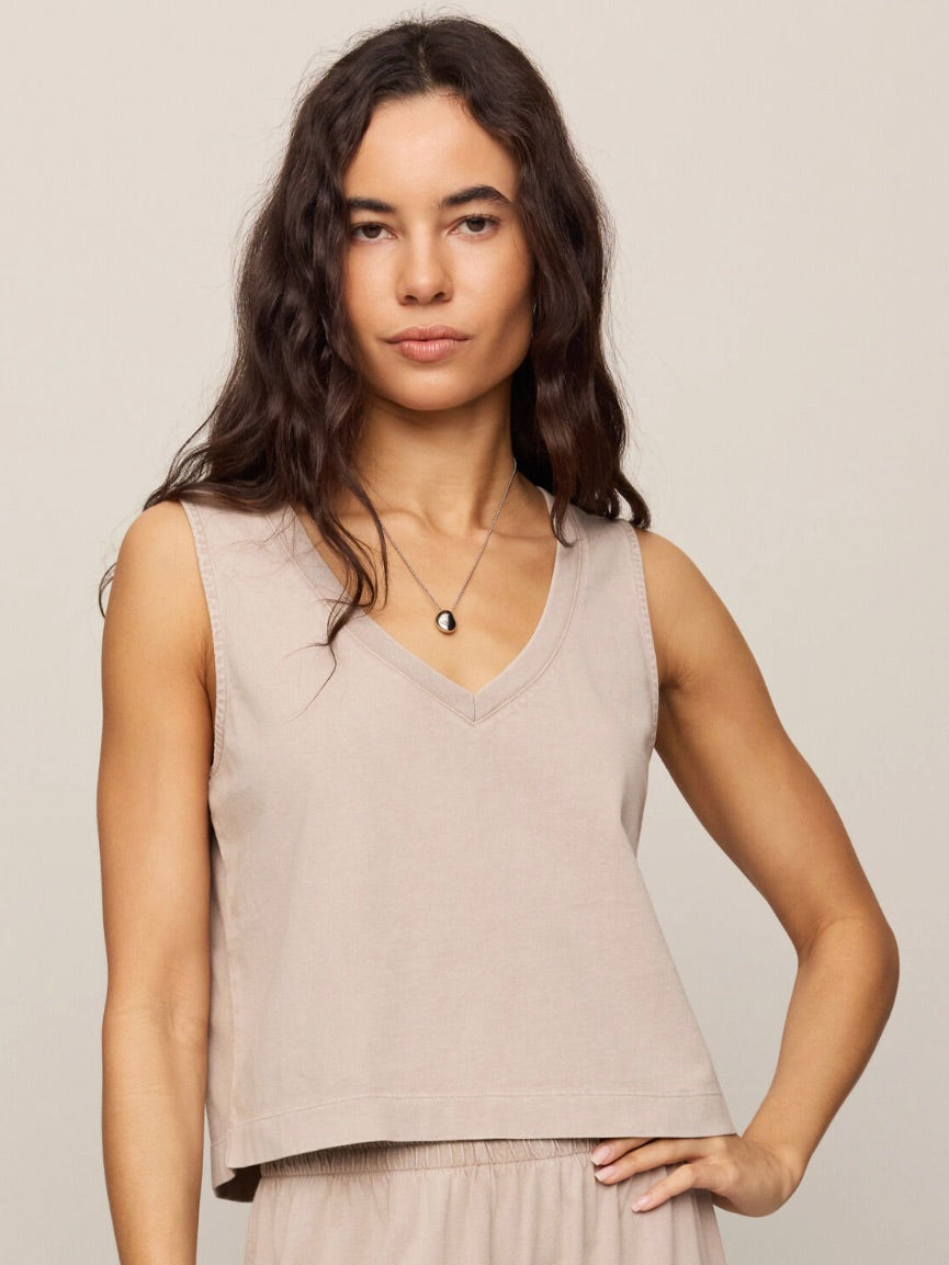 The Sloane V-Neck Top is easy, breezy, and made for everyday wear. Lightweight cotton jersey and a flattering sleeveless cut make it effortless to throw on. With subtle strap details and a relaxed fit, it’s a go-to top you’ll keep reaching for again and again.