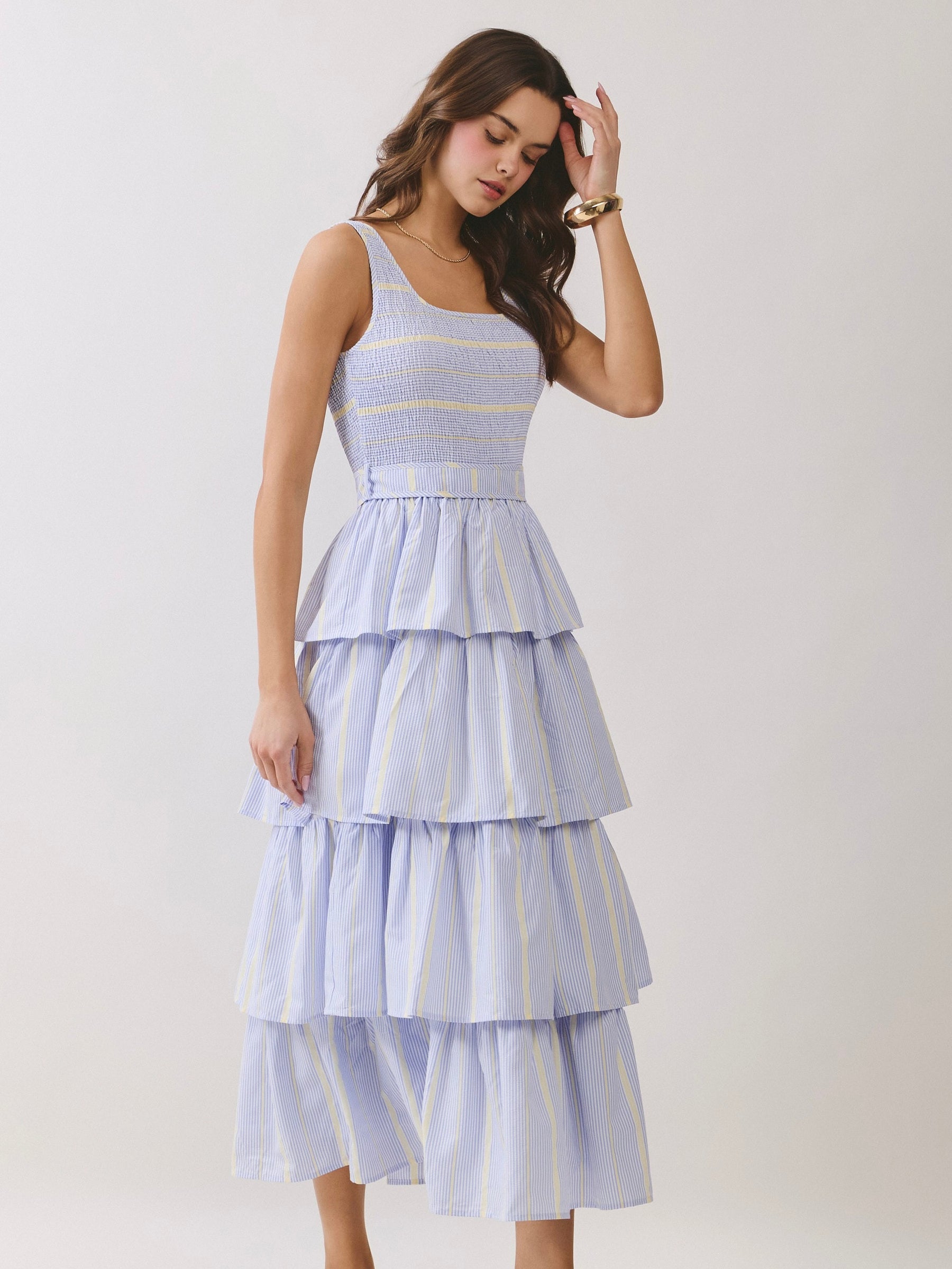 The Tatiana Tiered Dress is breezy, flirty, and full of movement. Its smocked bodice and self-tie waist create a flattering, cinched silhouette, while the tiered skirt adds playful volume. The scoop neckline and sleeveless design keep it light and easy to wear. Perfect with sandals or sneakers, it’s a go-to for effortless, all-day style.