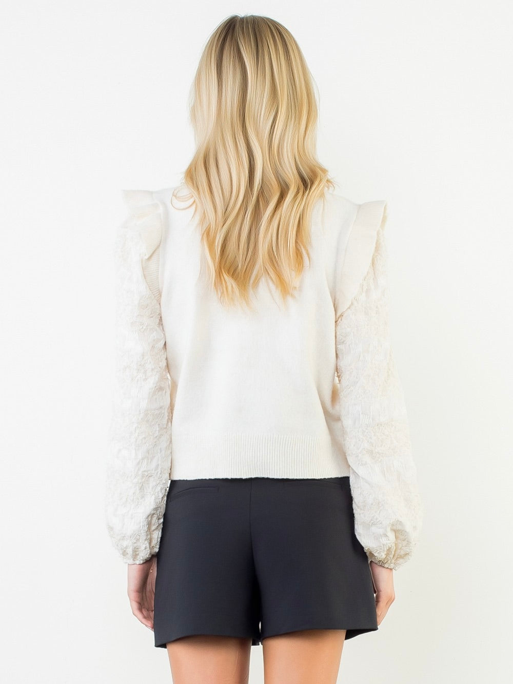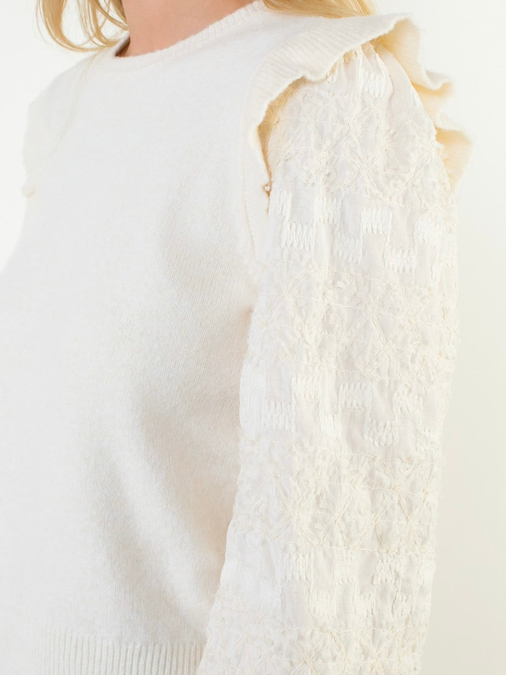 This Textured Long Sleeve Sweater adds a little extra charm to an everyday staple. Designed with a classic round neckline, softly ruffled shoulders, and textured sleeves, it brings subtle dimension without feeling overdone. An easy piece to style with denim or dress up with tailored bottoms.