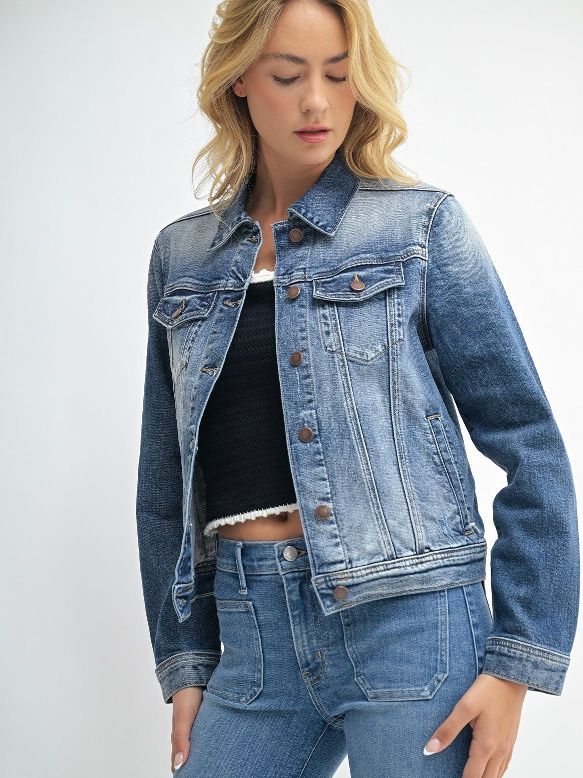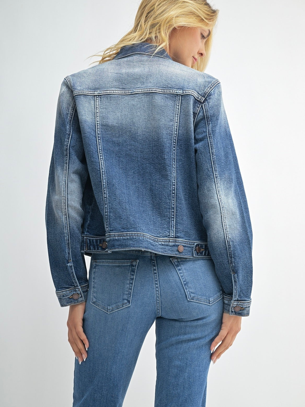 This jacket offers a fitted yet flexible silhouette that moves with you throughout the day. Its medium denim wash, paired with subtle fading, gives it a well-worn, lived-in feel, enhancing its timeless appeal.